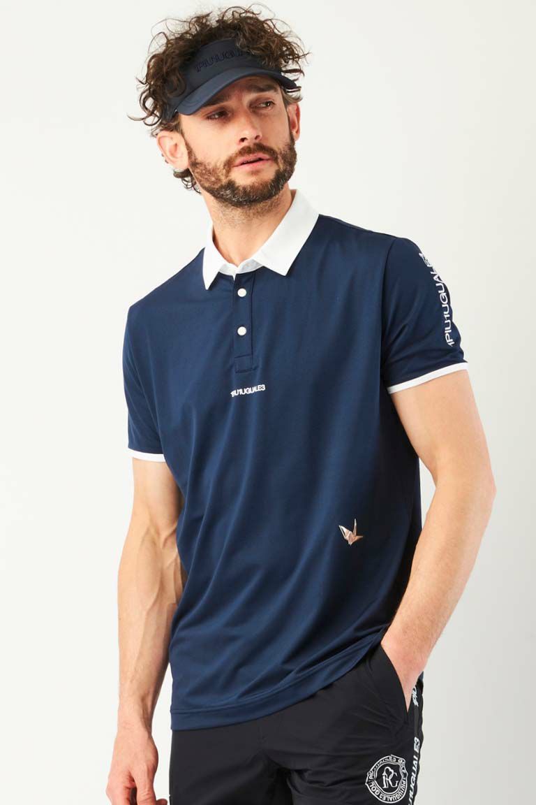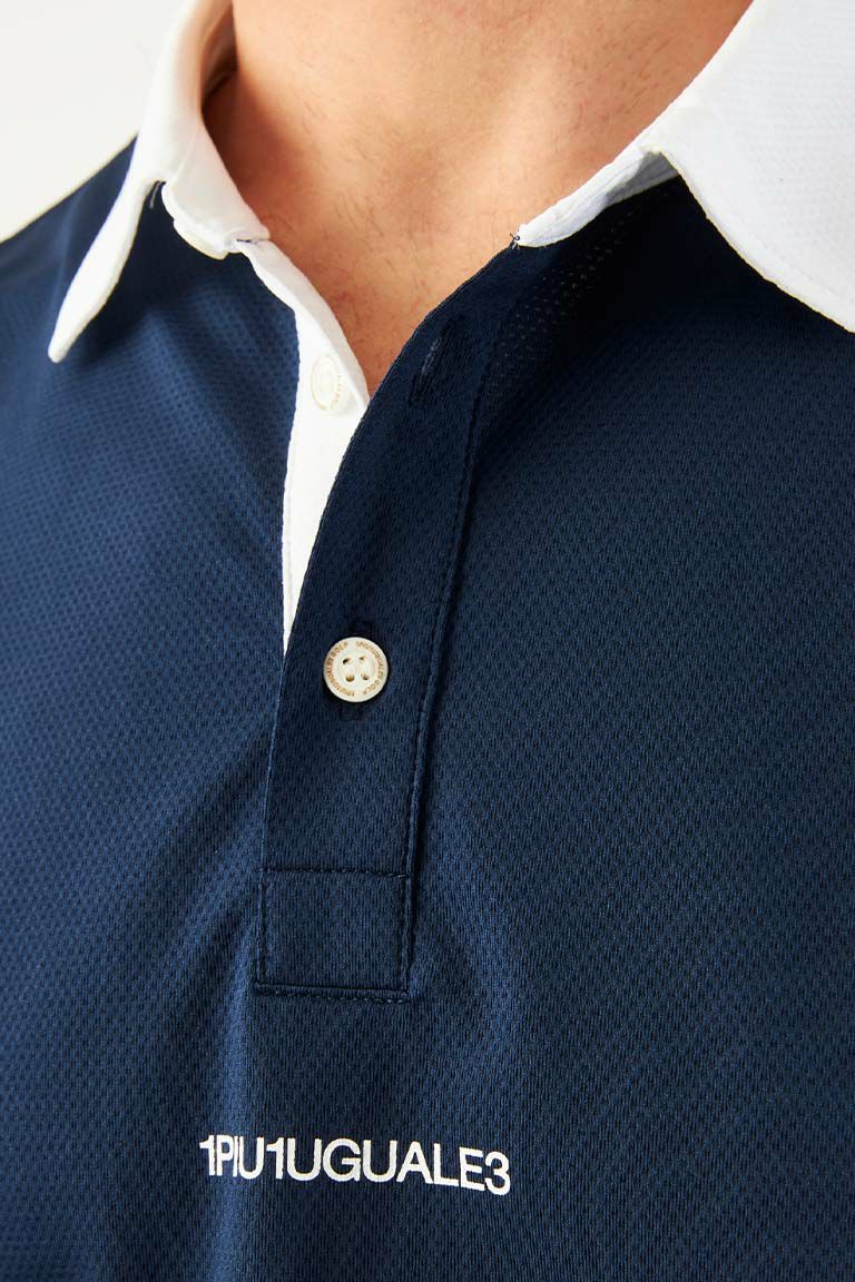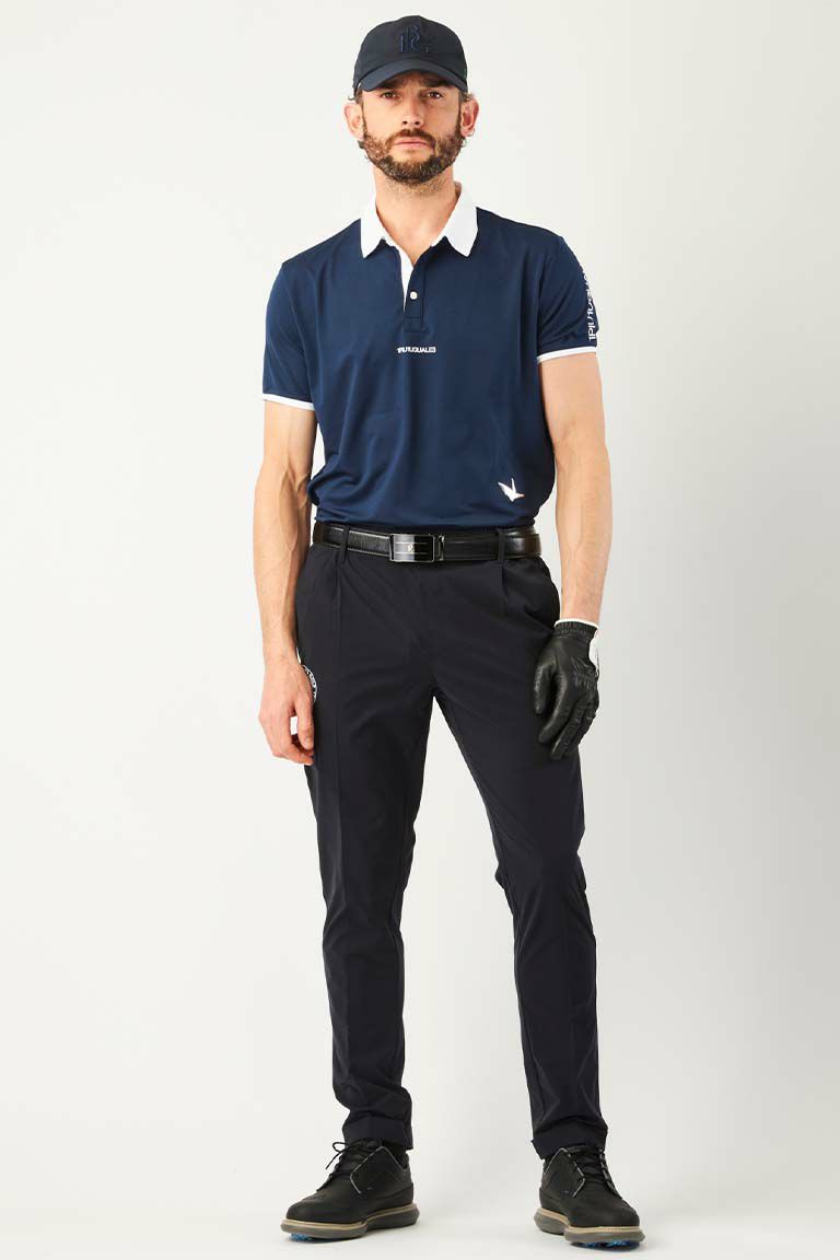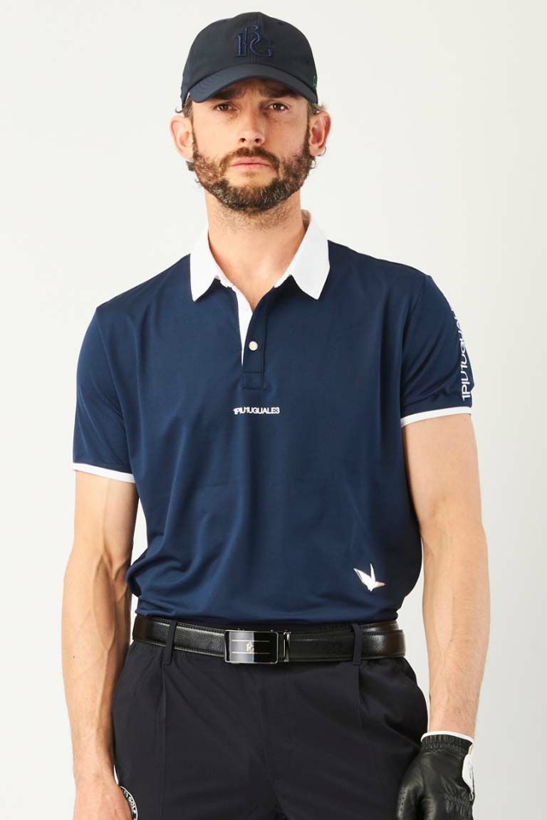 ゴルフに最適な素材です。襟と袖口に白生地を配し、軽さとスポーティさを表現しています。