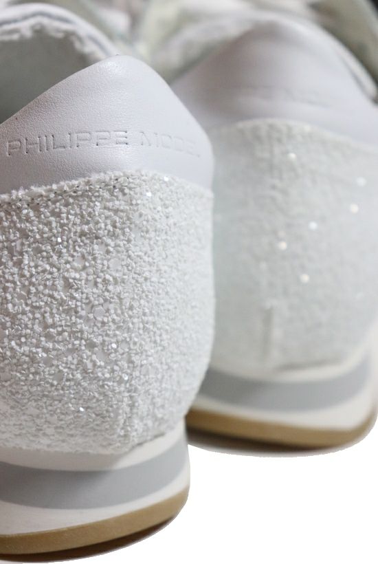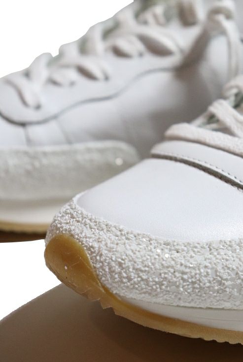 大人気モデルが再登場 1PIU1UGUALE3がブランドとして 世界初の別注をかけたPHILIPPE MODEL。 好評だった人気モデルが復刻・再入荷しました。 whiteカラーのこちらはカーフ素材を全面に採用。 トゥとヒール部には大中小様々のグリッターとラメを配し 爽やかでありながらゴージャスさを感じるモデルです。 ライニングには裏毛素材を用いており 裸足やショートソックス着用時にも心地良さを与えてくれます。 革靴と同じ手法で作られる特徴的なヒールカップも健在で シューレースを緩めたままでも踵が抜けないよう型作られています。 美しいフォルムと巧みなデザインが秀逸な、渾身の1足です。 ハンドメイドならではの独特な表情とクオリティー デザイン、機能性共に抜群のクオリティーを兼ね備える イタリアのハンドメイドシューズブランドPHILIPPE MODEL PARIS。 ButteroやChristian Louboutinなどヨーロッパの名立たる 靴ブランドでキャリアを積んだPaolo Gambatoと フランス人デザイナーPhilippe Modelが出会い 2008年にブランドがスタートしました。 フィリップモデルのコレクションは、ハイクオリティな 靴の生産地で知られているイタリアのヴェネト州 ヴェニス近郊の街Riviera del Brentで レザーカッティングや靴底の組み立て等 職人の細かな手作業によって生産されています。 熟練の職人技がプロダクツに反映され、まぎれもなく素晴らしい 良質でエレガントな価値あるスタイルが生み出されています。 手作業で作られる靴は、ハンドメイドならではの独特な表情を作り出し ひとつとして同じものは存在しません。