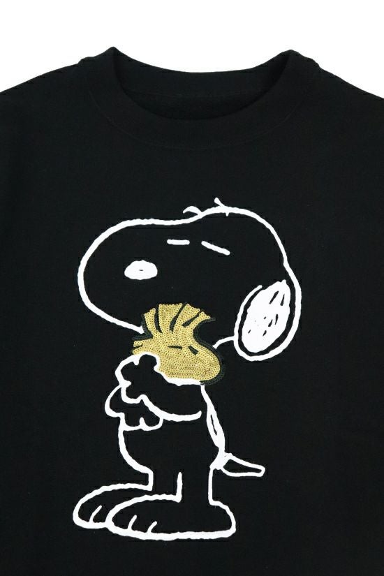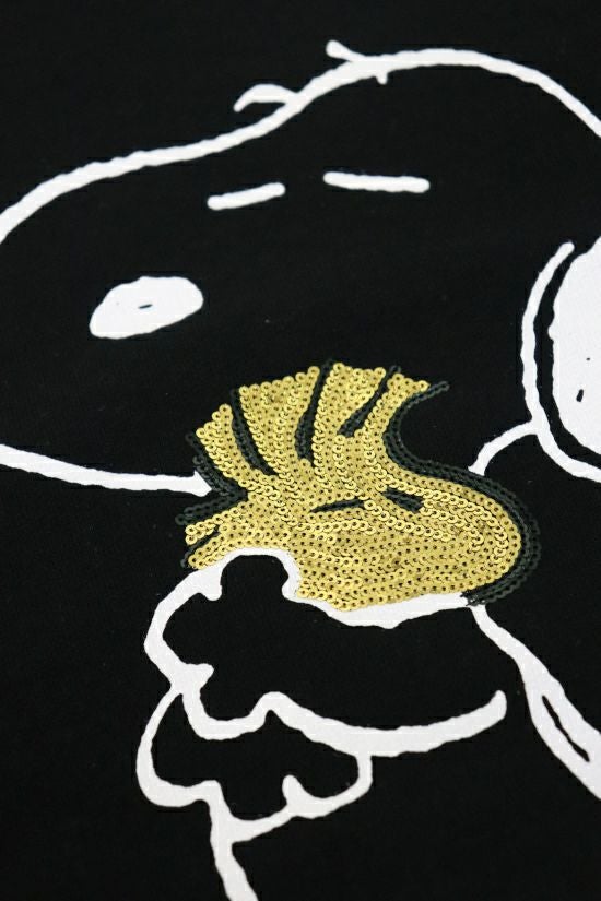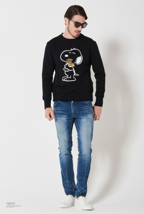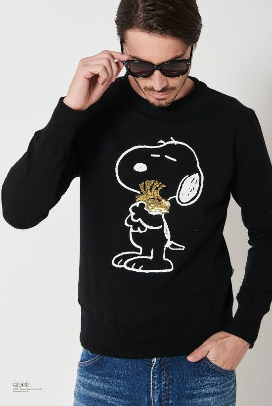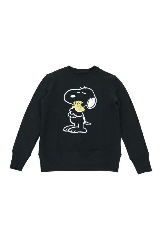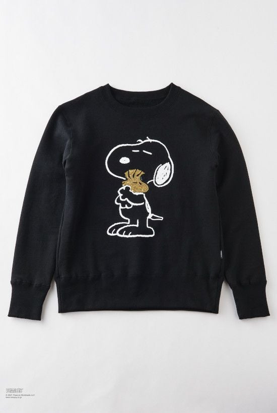 LEON掲載商品 『ピーナッツ』(英: Peanuts)は、1950年代からアメリカのチャールズ・M・ シュルツ氏によって描かれたコミック。 掲載された雑誌は2,000誌を越え、世界75か国・21言語で3億5,500万人 以上の読者を持ち、コミックの総発行部数は4億部を越える人気作品です。 お馴染みのキャラクターであるスヌーピーが親友のウッドストックを抱き抱えている「BEAGLE HUG」(ビーグルハグ)の様を表現しました。 ビーグルハグとはPEANUTSの作者チャールズ・シュルツ氏がコミックの中で生み出した大切な思いを分かち合う時の合言葉です。 原作ではビーグル犬のスヌーピーはもちろん他の登場キャラクターがハグし ているシーンが沢山描かれ、言葉にできない思いを伝えるボディーランゲージ のような意味合いで使われています。 イラストの線はプリントで、ウッドストックのみゴールド色のスパンコール刺繍にて表現しております。 ホワイト、グレー、ブラックの3色展開。 クルーネックスエットは身幅に若干ゆとりを持たせたシルエットで、素 材はアメリカン空紡裏毛を採用。 アメリカで生産された綿花は他の綿に比べて油分が少なく、シャリ感が出ます。 そのシャリ感のある米綿を空気紡績することでさらに独特なシャリ感と ハードな質感を生み出しています。 後身の首下にはこのコラボの為に作られた1piu1uguale3ロゴ、また側面にはピスネームを配しています。