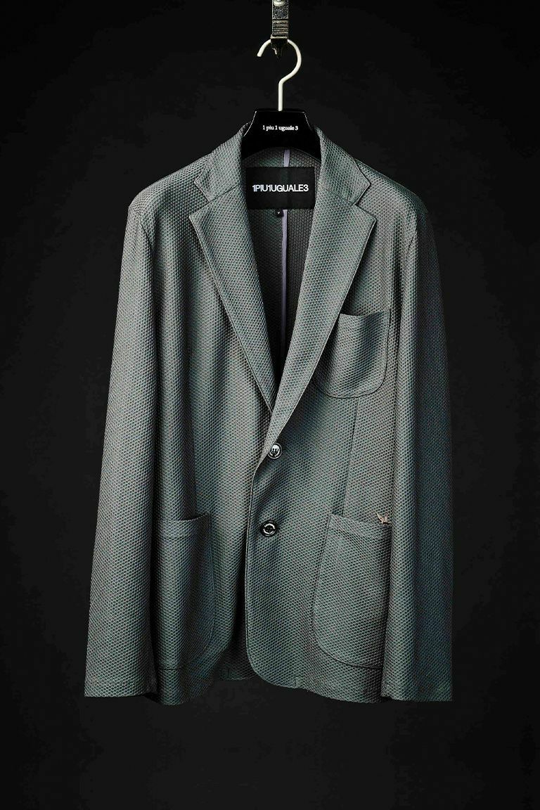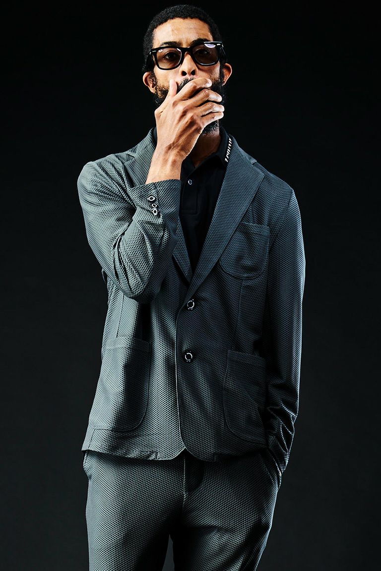 ノン・パディングで形成されたTECHNICAL MESH TAILORED JKでは縫製のつなぎ目を手作業で行い芯地を入れず着用時の美しさを強調。