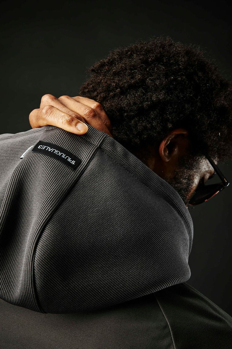 フード部分と両袖・裾には別繊維で編み立てた高密度フライス素材。