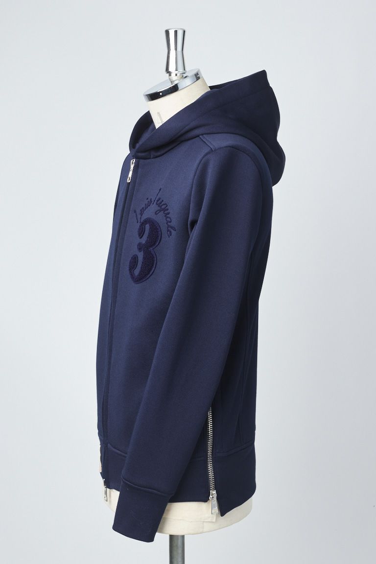 SIDE ZIP PARKA NO.3ワッペンのスウェットパーカー ベースの型を新たにパータンメイキングし、 裾のサイドZIPが特徴です。 製品加工後にサガラ刺繍による アイコニックなブランドロゴを施しています。 フードは首に乗るように形成し適度なサイズで構築し、 前身と後身の着丈に差を付けることで 独自の間のあるタイトフィットとファスナーを 開いた際にこなれた印象を醸します。