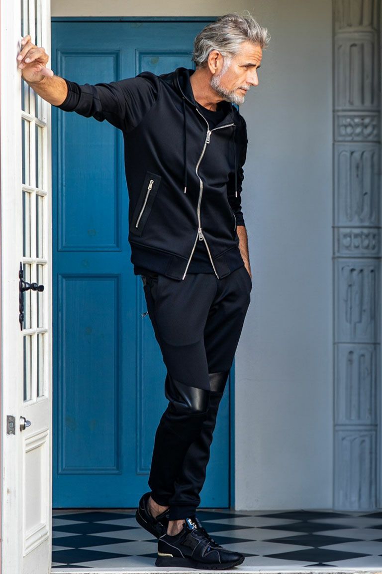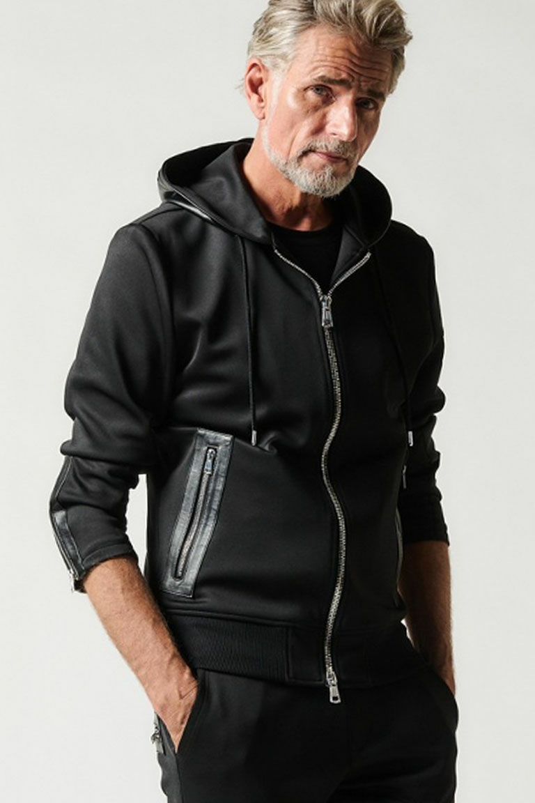 パーカーはライダースのディテールをそのまま落とし込みながらも、