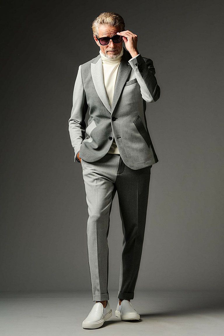 毎シーズン定番として展開しているRIB SET UPシリーズの表地クレイジー仕様です。 1960~70年代のテーラードジャケットを検証し、クラシックなディテールはそのままに、 素材使いとデザインによって構築したテーラードコレクション。 シルエットを決めるアームホールの形状、カマのバランス、全体のゆとり分量を すべて計算し構築した至高のシルエットが生み出されています。 脇にキックバックの良いテレコ(リブ)を採用することで、 デザインと共に着心地を向上させ、テーラードの仕上がりを損なうことなく、 ノンストレスでデイリーに着こなせるセットアップに仕上げています。 裏始末はテーラードの基本である「雨蓋つき本台場仕立て」、 背裏は軽さを意識した観音仕立てで、胸ポケットの袋布をチーフに見立てた 遊び心あるディテールを採用しています。 また、1piu1uguale3オリジナルの折鶴ピンがラペルに付属しています。 スラックスタイプのパンツはクラシックな佇まいを崩すこと無く実用性を高めた仕様です。 ジャケット同様にパイピング・シック布などのクラシックなディテールはそのままに、 ウエストベルトにテレコを採用。同時に脇の立体切替部もテレコを使用することで、 至高の着心地を実現させています。