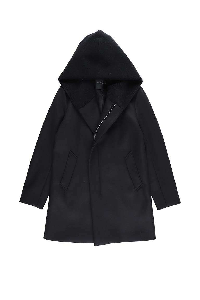 大きめなフードが特徴的なフーデットコートはフードが前に落ちるように分量配分し、
