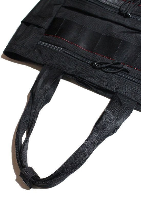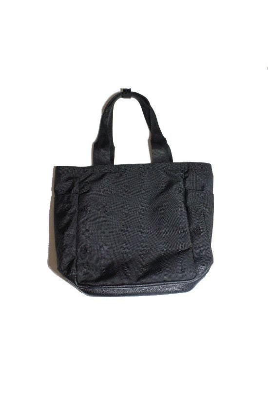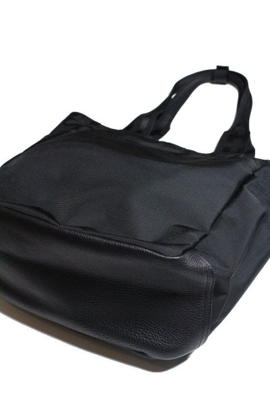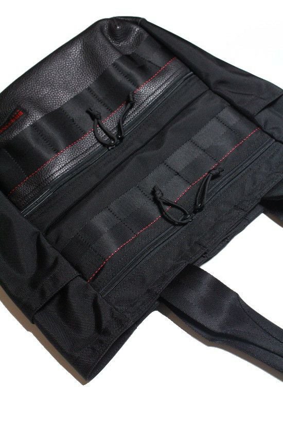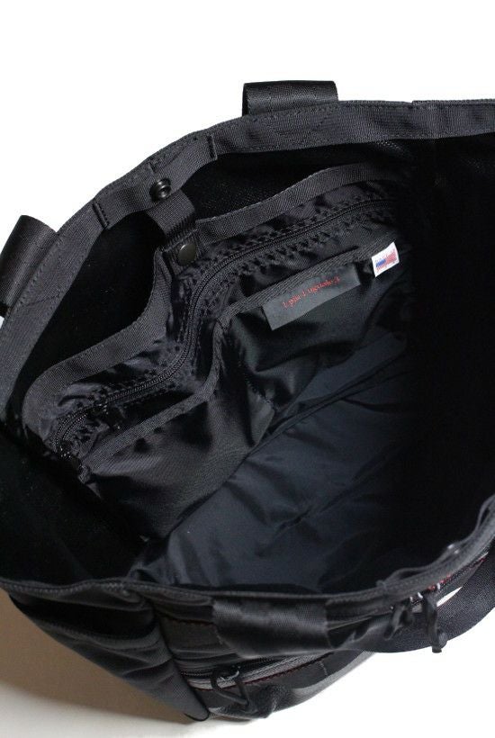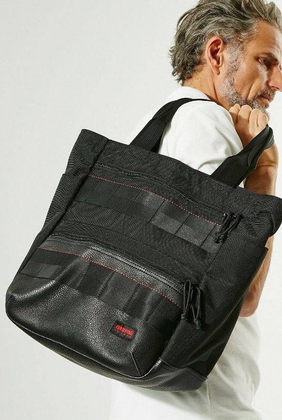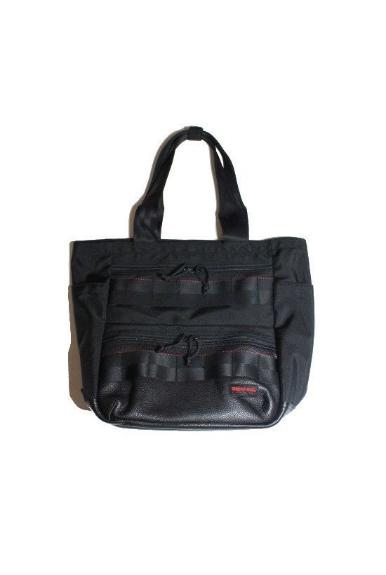 1PIU1UGUALE3×BRIEFINGの第3弾は マルチポケットの機能性トートバッグ。 前回のバックパック同様、日本国内で裁断した革を 輸出・BRIEFING米国工場にて縫製するという コラボレーションならではのオペレーションによって 製作されたバッグは、素材に米国陸軍御用達の耐久性に優れた BALISTIC NYLON(バリスティックナイロン)と本革をコンビで仕様。 革は厳選した牛シボ革「黒」と オリジナルで作製した牛ヌバック革「赤カモ」の2パターンを展開。 革からイメージされるラフな印象も相まって 米軍規格"を体現したような仕上がりとなっています。 メイン収納部分は仕切りがなく大きく使え、大小のポケットが付いています。 ファスナーポケットの他にスナップ留めのスペースもあり 用途に応じた使い方が可能な仕様です。 外側のポケットは上側が大きいサイズ向け 下側は仕分けがついた小さめと使い易さを考えた造りとなっています。 どちらもダブルジップで 両方向から開け閉めできる事も利便性を高めています。 米軍規格の製品を生み出すBRIEFING ミルスペックと呼ばれる米国軍用規格に準拠した ヘビーデューティなパーツを用い タフなバッグを作り続けているバッグ・ブランド。 機能的かつ高感度なデザインと設計を元に 米国陸海軍、SWATなどのプロユースのプロダクトを手がける 米国内のファクトリーで製造されています。 ミリタリー仕様の耐久性と信頼性のある素材やパーツの良さを 最大限に生かしながら、デイリーユースで 最適なディテールとサイズを与えられたアイテム達は ヘビーデューティ好きのみならず ビジネスシーンでも幅広い支持を得ています。