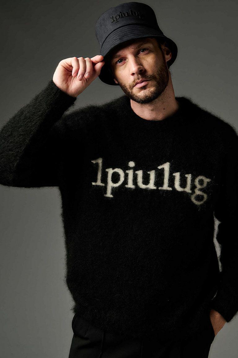 「1piu1ug」ロゴは手作業工程が発生するインターシャ編みで