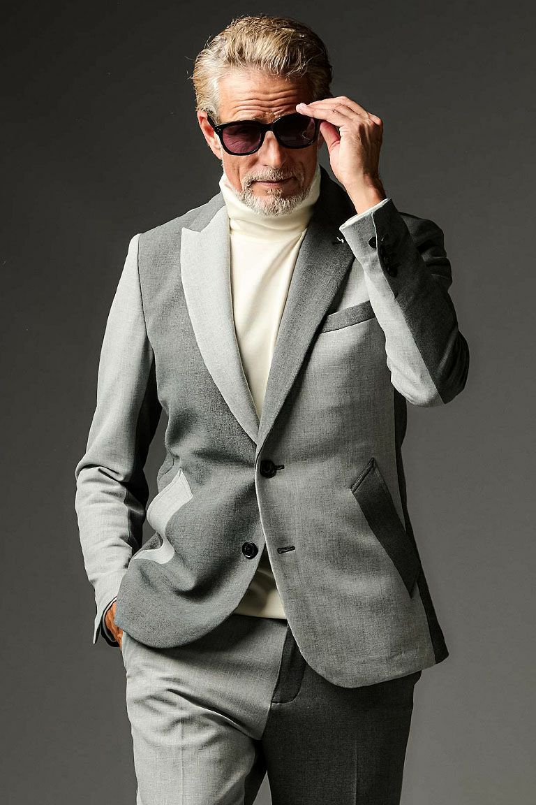 毎シーズン定番として展開しているRIB SET UPシリーズの表地クレイジー仕様です。 1960~70年代のテーラードジャケットを検証し、クラシックなディテールはそのままに、 素材使いとデザインによって構築したテーラードコレクション。 シルエットを決めるアームホールの形状、カマのバランス、全体のゆとり分量を すべて計算し構築した至高のシルエットが生み出されています。 脇にキックバックの良いテレコ(リブ)を採用することで、 デザインと共に着心地を向上させ、テーラードの仕上がりを損なうことなく、 ノンストレスでデイリーに着こなせるセットアップに仕上げています。 裏始末はテーラードの基本である「雨蓋つき本台場仕立て」、 背裏は軽さを意識した観音仕立てで、胸ポケットの袋布をチーフに見立てた 遊び心あるディテールを採用しています。 また、1piu1uguale3オリジナルの折鶴ピンがラペルに付属しています。 スラックスタイプのパンツはクラシックな佇まいを崩すこと無く実用性を高めた仕様です。 ジャケット同様にパイピング・シック布などのクラシックなディテールはそのままに、 ウエストベルトにテレコを採用。同時に脇の立体切替部もテレコを使用することで、 至高の着心地を実現させています。