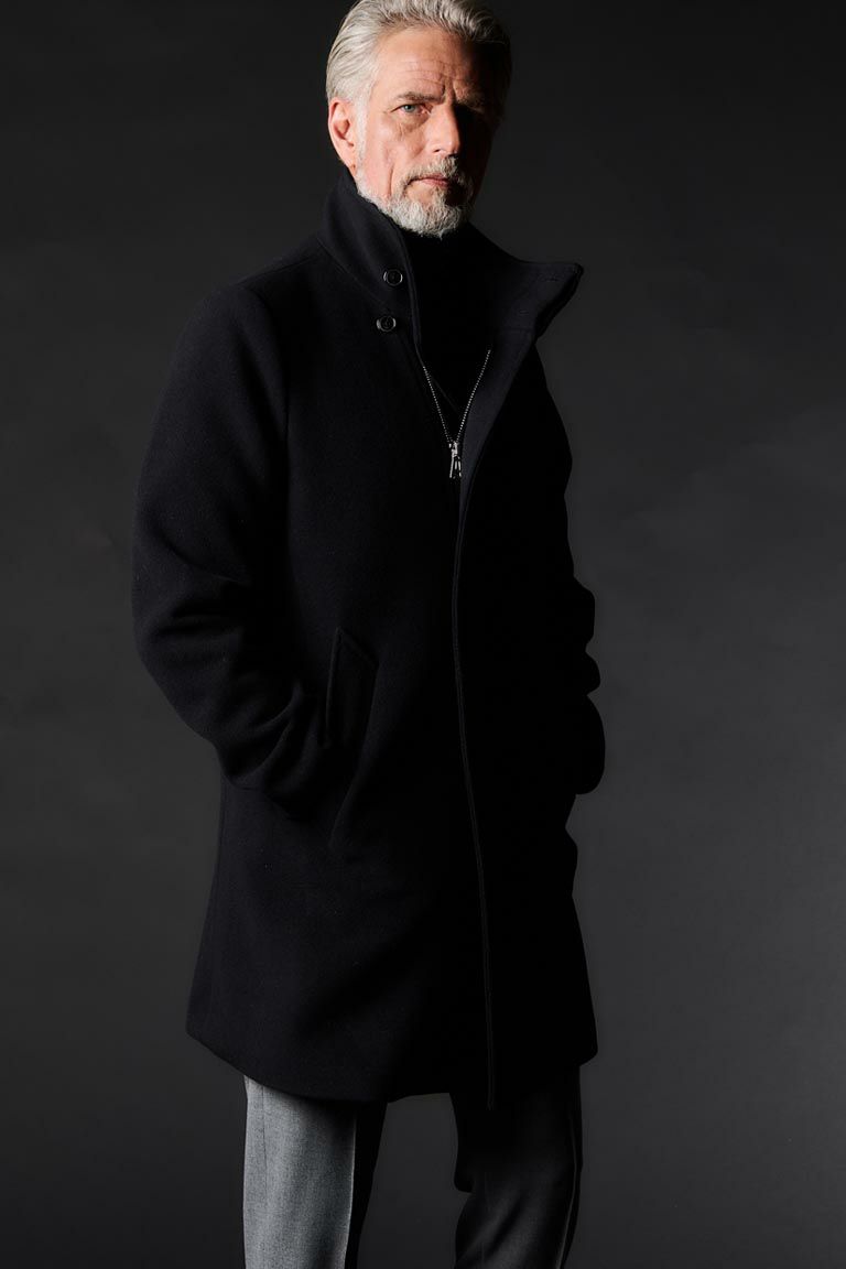 数年ぶりの登場となるWRAP STAND COAT。 襟腰を付けることでネックに添い立つよう計算しパターンメイキングしています。 スタンドタイプは襟元のボリュームがモード感を演出します。 クラシックな仕立てに見られるセンターベント始末と箱ポケット仕様が カジュアルな印象を払拭し上品な印象を与えます。 付属も抜かりなく、ZIPPERはイタリア・ラッカーニ社の最高級ラインである SUPER RACCAGNIを採用。 生産国:日本