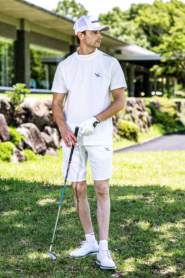 通気性に優れたメッシュ素材を用いたメンズセットアップです。 モックネックトップスはベーシックなサイズ感で、 単品使いでもコーディネートしやすく、ショーツは生地を切り替えることで 余裕のあるシルエットに仕上げ、可動域も向上させています。 ボトムスはサイドをドットエアーで切り替え、 裾をラウンドさせたデザインで、動きやすさと上品さを両立。 春夏のラウンドでも快適にお召しいただけます。 カラーはWHITE、KHAKI、BLACKの3色展開で、 KHAKIのみワッペンカラーをゴールドにあしらっています。 1PIU1UGUALE3 GOLF(ウノピゥウノウグァーレトレ ゴルフ) 日本から世界に向けて発信するブランドとして世界中の上質な素材を贅沢に使用し、 ラグジュアリーな商品をリリースし続ける1PIU1UGUALE3。 ハイエンドラグジュアリーブランドが提案する、高いデザイン性とスポーツの機能美を併せ持ち 上質を知る全てのプレイヤーの為のウエアとしてリリースいたします。 革新的なハイテク素材を採用し、ただ派手な物ではなくテーラーリングを得意とする 同ブランドならではの立体パターンにより、洗練された高いデザイン性と 最高のフィッティングを兼ね備え着る者全てに高揚感と優越感をもたらします。 【ワッペンロゴに関するご注意】 本製品に使用しているワッペンロゴ(鶴+113G)は熱圧着加工にて取り付けを行っておりますが、 上質な生地を採用している為、素材特有の滑らかさや洗濯環境の影響により まれにワッペンが剥がれやすくなる場合がございます。 ※万が一剥がれが生じた場合は、弊社にて修理対応を承りますのでお気軽にご連絡ください。