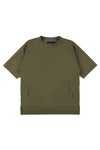 ビッグシルエットのポケット付き半袖クルーネックTシャツです。 ジャージ生地ではなく、布帛生地(ストレッチあり)にてTシャツ型のアウターを発表します。 ビッグシルエットのためリラックスした着こなしができるうえに 身体のラインがわかりにくくなり、体型カバーも期待できます。 裾にはスリットを入れて、着丈に前後差を付けることでこなれた印象をプラスしています。 腰ポケットはミリタリーブルゾンの代表格であるMA-1のポケットを踏襲し、 ドット釦はイタリア・フィオッキ社製で1PIU1ロゴ入りです。