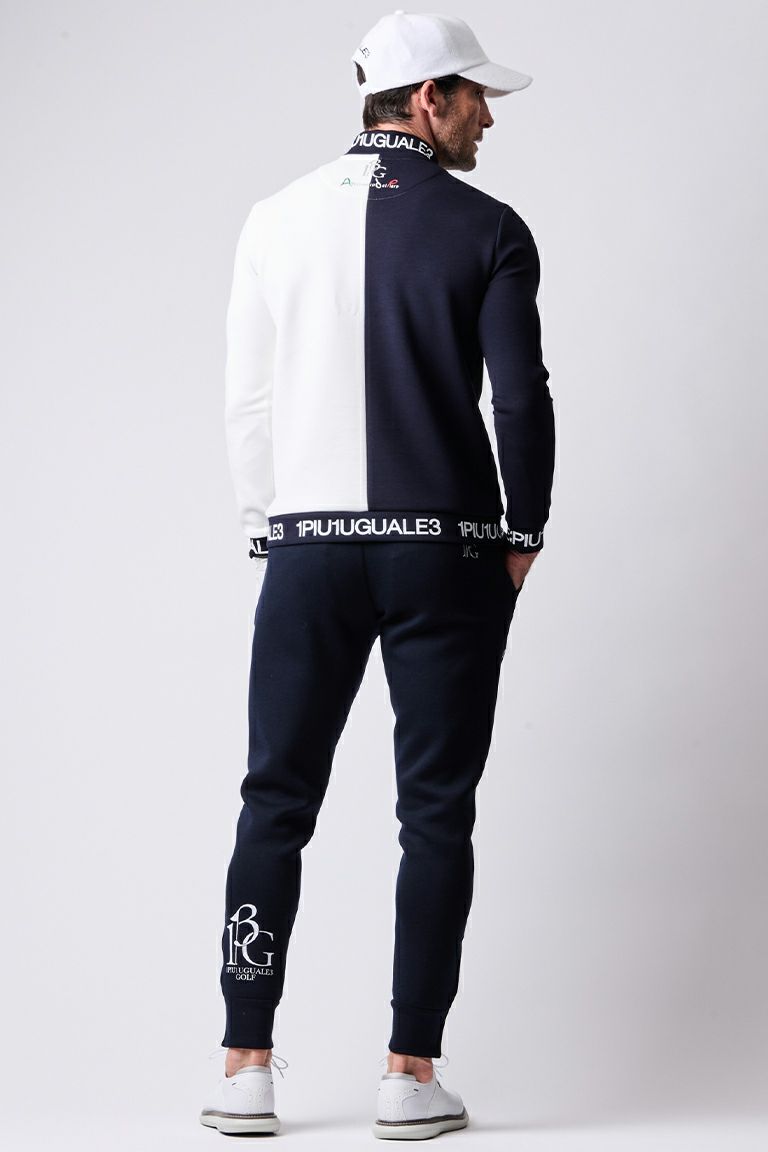 左右でカラーを切り替えて、ネック・袖口・裾にロゴプリントを配し、