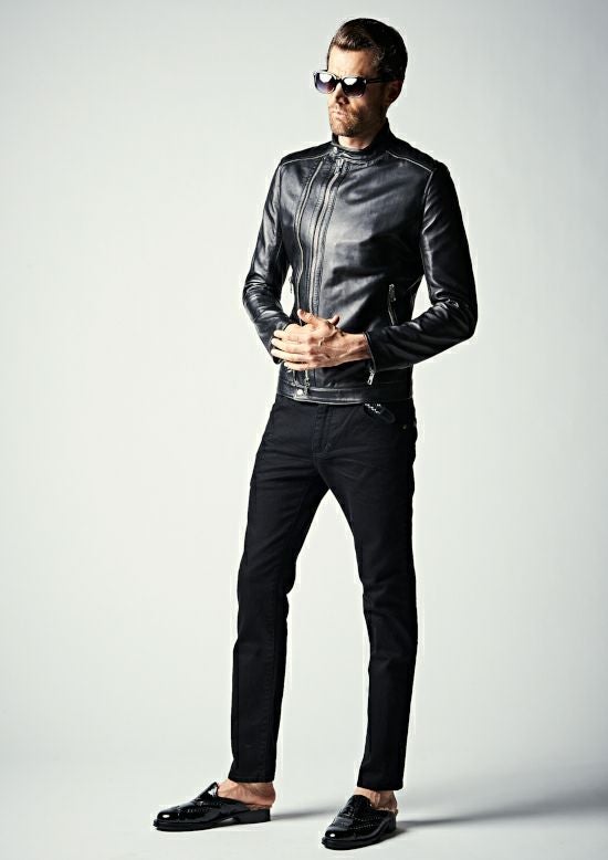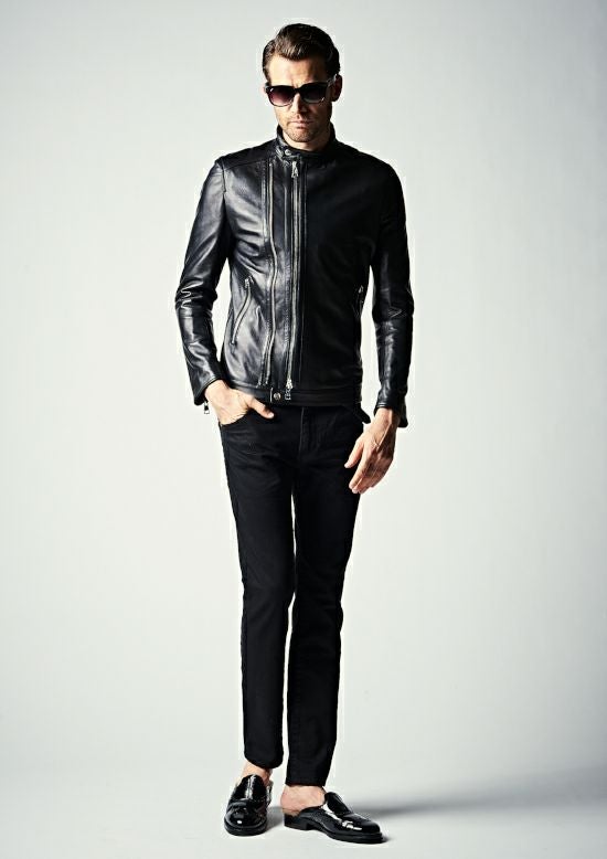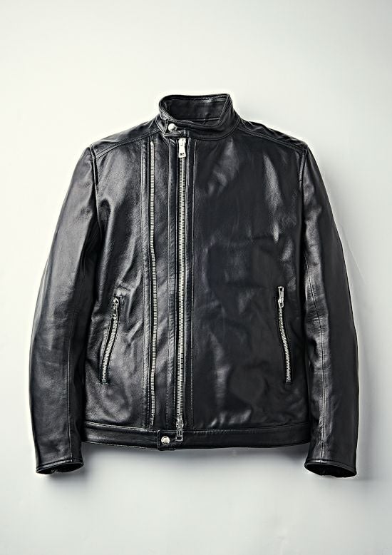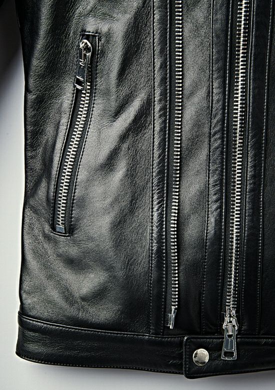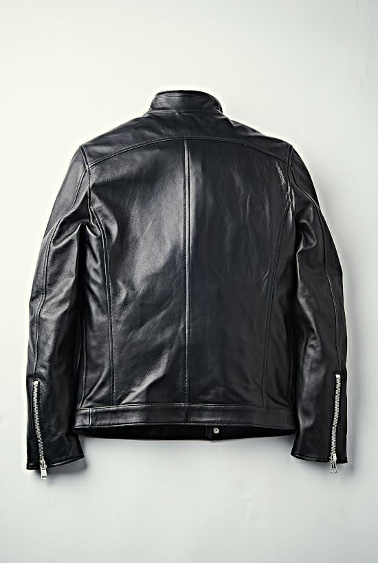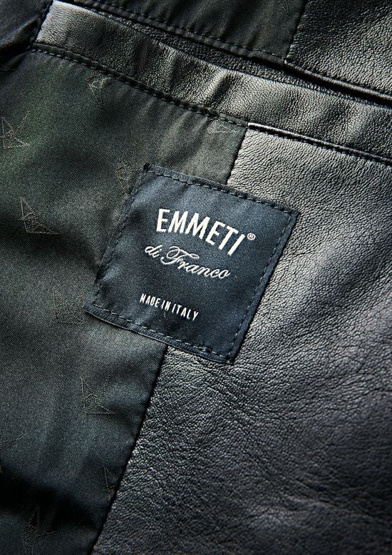 【DETAIL】 この企画に使用しているレザーはナッパシルクレザーの0.7 ミリ厚。通常は0.5 ミリ厚のところ別注で0.7 ミリ厚に厚くしています。 このレザーはイタリアのタナリーで鞣されたラムスキンナッパです。クロームで鞣されている為、ムラの無い繊細な仕上げが特徴です。長く使用しても経年変化は少なく、綺麗な風合いを長く楽しめるレザーになります。 エンメティは日本人の体型に合わせた構築的な着心地を実現する為に、毎シーズン縫製を進化させており、特に肩周りは日本人に合う着心地が考慮された型紙により縫製をしています。 今回日本でオリジナルパターンを組み上げており、より立体的なパターンで着丈や袖丈含む全体のバランスを整えて作り上げています。 シングルライダースをベースに前立てをダブル仕様にした、変形シングルライダースです。 ネックベルトの後ろ側をダブルの高さにし、立体的な仕様にし、よりスタイルが美しく見える様に仕上げています。 従来のライダースより若干着丈を長めにし、ジャケット感覚で羽織れるレザーブルゾンです。 Fiocchi ITALY のスナップ釦にオリジナルロゴをレーザー刻印したスナップ。ファスナーはスーパーラッカーニを採用。
