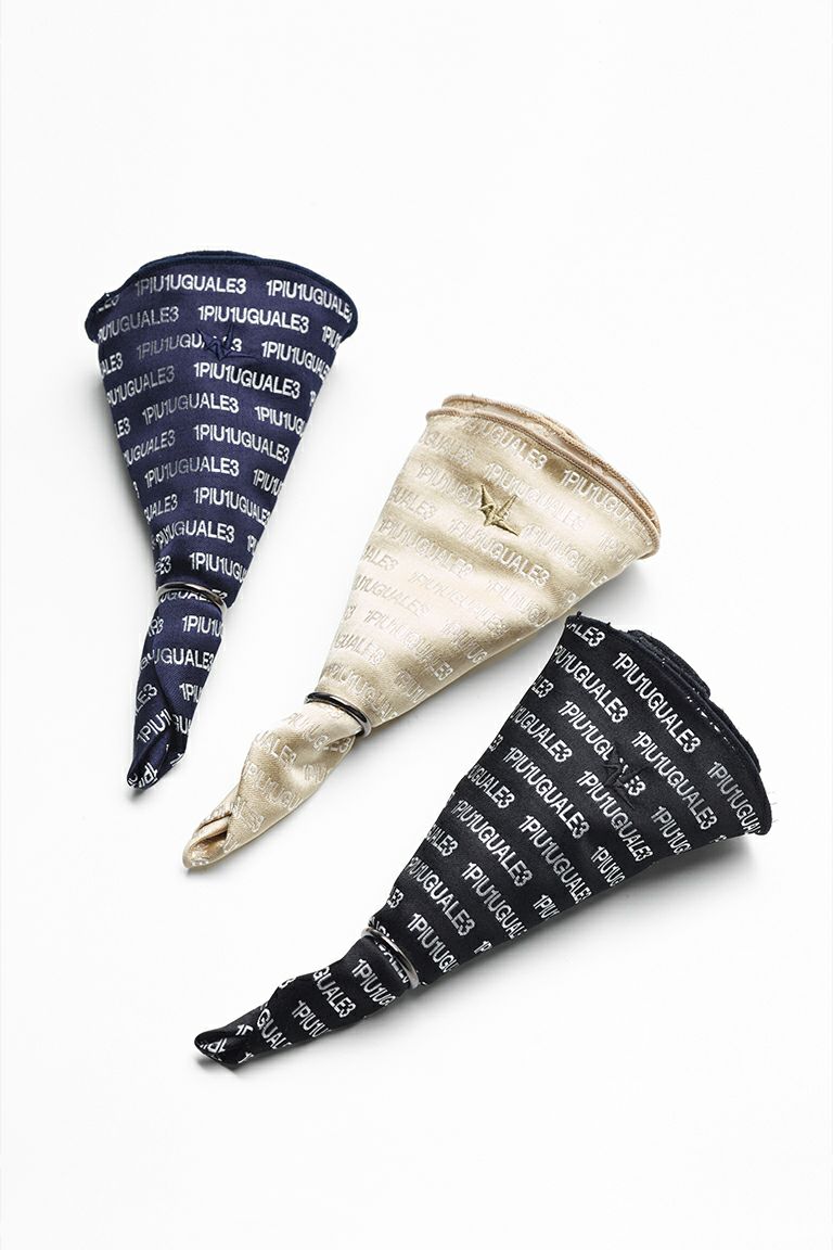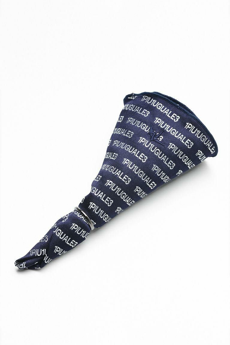 BIAS LOGO MONOGRAM ROUND CHIF (鶴刺繍ワンポイント) ブランドロゴである1PIU1UGUALE3を極細シルク糸と、 高密度なジャカード織りで繊細に表現しつつ、 シルク素材の滑らかな光沢感にも拘った グラフィカルなモノグラムパターンのチーフです。 ブランドアイコンの折鶴を立体的な刺繍で 表現したワンポイントは、サテン地のベースカラーに 合わせたカラーでシャドーな表現となっており グラフィカルな中にもシックなアクセントに 仕上がりになっています。