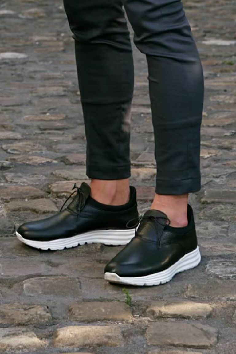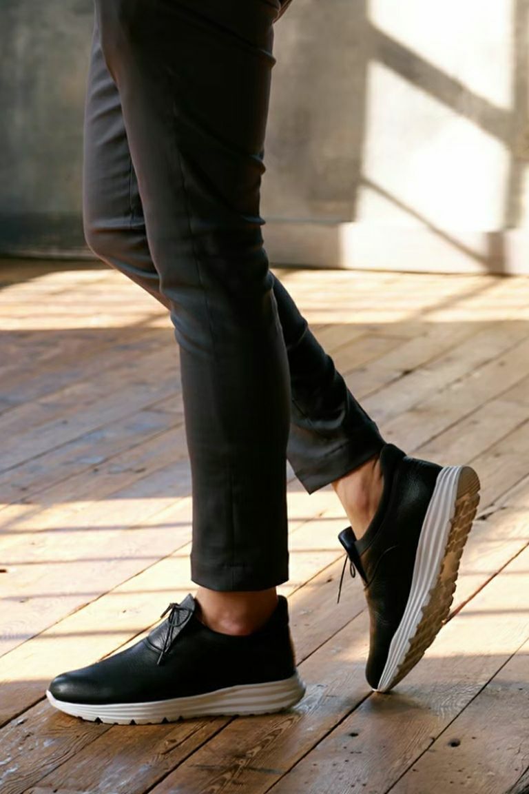NEO PLANE SNEAKER 日本の某革靴ファクトリーに依頼したレザースニーカーです。 アッパーの革はヨーロッパの原皮日本でなめした 上質なカーフを使用しています。 ヨーロッパの大きな大地でストレスなく育っているので 革質も非常に良いです。 ソールは本格的なスニーカーソールなので、 もちろん走る事は可能なアクティブソールを採用しています。 靴の基本的考え方は「革靴×スニーカー」です。 ソールはスニーカーですが、基本的な作りは革靴です。 ラスト設計、製靴技術は革靴メーカーならではの ノウハウが詰まっています。 スニーカーメーカーでは使用しない足なり構造の ラスト設計パターンの制作、釣り込み等でフィッティングを 重視した靴作りをしています。 トラディショナルなアッパーデザインと軽快なアウトソールにより 「走れる革靴」として用途はかなり幅広く使っていただけます。 革の断面も織り込むことによって 非常に美しい仕上げを行っており、 ドレス見えするスニーカーとしてお使いください。