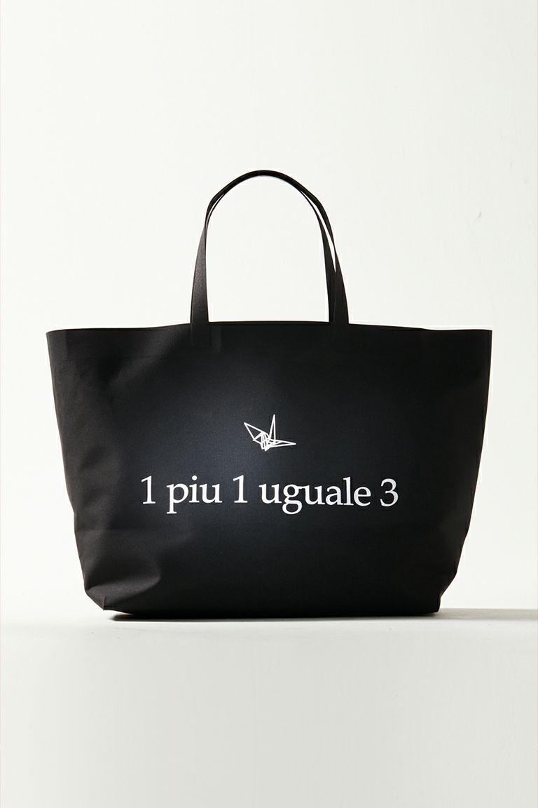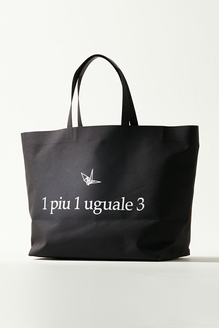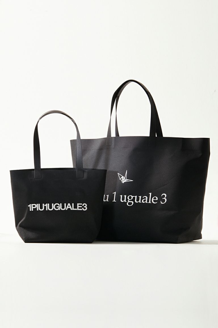 片面には「折鶴+1piu1uguale3」小文字ロゴ、 もう片面には「1PIU1UGUALE3」大文字ロゴを配した 新型トートバッグです。 シンプルなデザイン性に加え、 本体生地はミシンを使わずウェルダー圧着という 手法を用いて縫い合わせており、 高い気密性と防水性を兼ね備えています。 表地はポリエステル100%で撥水性、防汚、 イージーケアと機能性に優れ、普段使いに丁度良いです。 サイズは大、小の2サイズをご提案します。