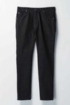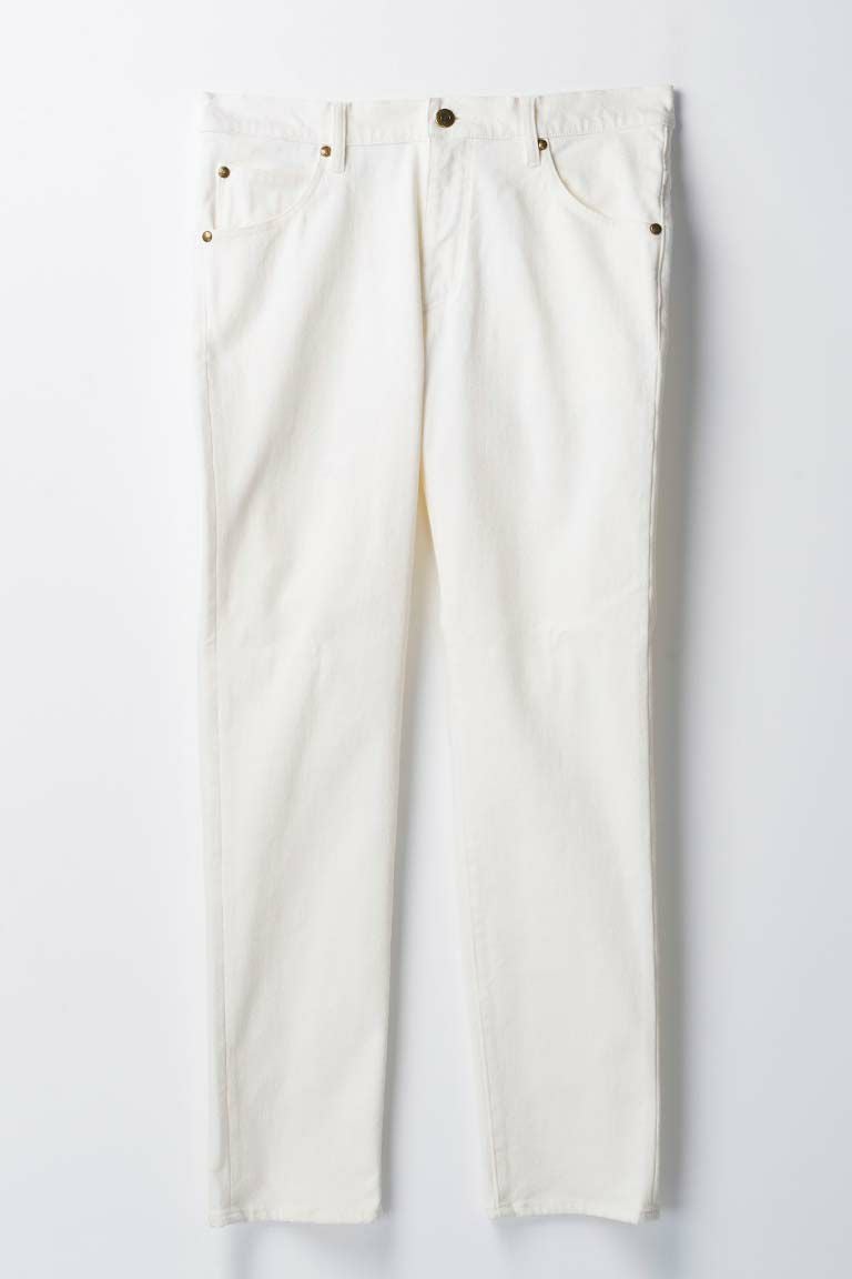 定番として毎シーズン展開している9 TAPERED型の5ポケットパンツです。 適度な深さのある股上で膝から裾に向かって一気にテーパードをかけて細く絞っています。 加工は縮率を安定させる為のワンウォッシュのみ。 縫製は名立たる海外ビックメゾンを手がけてきた縫製工場にて その中でも限られた熟練の職人により縫製を施し匠の技により 日本のいわゆる「デニム」とは一線を画するシャープなデニムに仕上がっています。 タック釦・リベットはすべてオリジナルロゴ入りの物を使用し、 縫製・加工すべての工程が終わった最終工程に打ち込んでいます。 ファスナーは定番であるイタリアのラッカーニ社製を、 ポケット袋布にはやや太番手を使用した甘織りのツイルを使用。