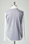 1piu1uguale3の定番として展開している襟先の広がったホリゾンタルカラーを採用したプレーンシャツで後身のみをストライプ生地で切替えています。 首元の見え方を重視し、襟開きが180度に近く、ややオープンカラー気味に綺麗に開く様に形成しています。 襟型の修正・着丈を短く変更・丸みのあるショルダーラインを表現。 【表地:J-CAMICIE】 超ハイゲージのジャガードで編み上げることにより、まるでシャツのようなカットソーを完成させました。 カットソーなので、今までにはなかったストレッチ性があり、快適な着心地を楽しめる素材となっています。 フォーマルな装いにノンストレスの着用感を可能にしています。 附属する釦はドレスシャツによくある貝釦ではなく、1piu1uguale3 ロゴ入りの本水牛骨白釦を採用。
