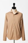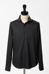 1piu1uguale3の定番として展開している 襟先の広がったホリゾンタルカラーを採用したプレーンシャツ。 首元の見え方を重視し、襟開きが180度に近く、 ややオープンカラー気味に綺麗に開く様に形成しています。 附属する釦はドレスシャツによくある貝釦ではなく、 1piu1uguale3 ロゴ入りの本水牛シャツ釦を採用しています。