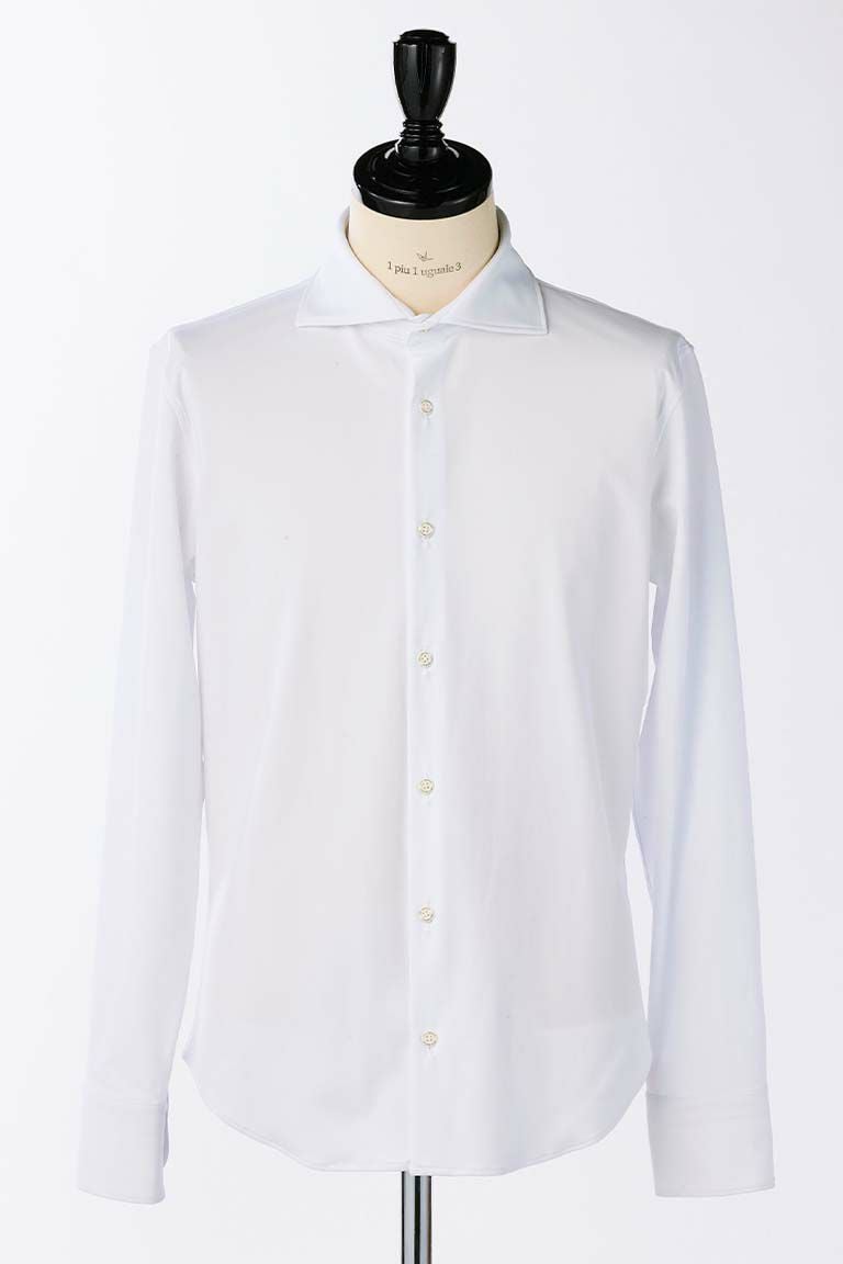1piu1uguale3の定番として展開している 襟先の広がったホリゾンタルカラーを採用したプレーンシャツ。 首元の見え方を重視し、襟開きが180度に近く、 ややオープンカラー気味に綺麗に開く様に形成しています。 附属する釦はドレスシャツによくある貝釦ではなく、 1piu1uguale3 ロゴ入りの本水牛シャツ釦を採用しています。