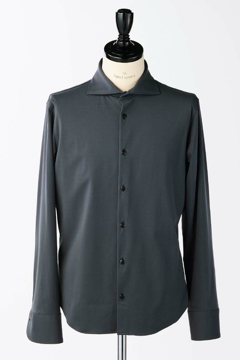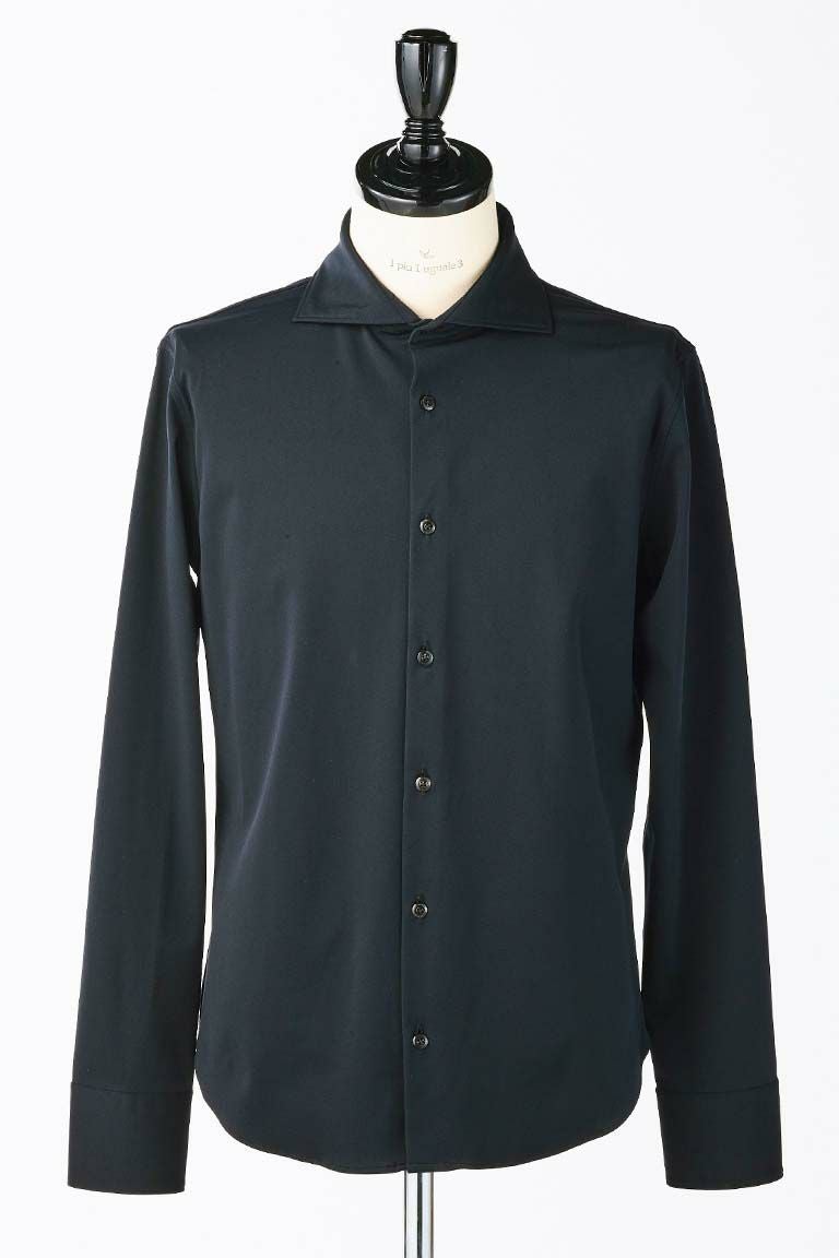 1piu1uguale3の定番として展開している 襟先の広がったホリゾンタルカラーを採用したプレーンシャツ。 首元の見え方を重視し、襟開きが180度に近く、 ややオープンカラー気味に綺麗に開く様に形成しています。 附属する釦はドレスシャツによくある貝釦ではなく、 1piu1uguale3 ロゴ入りの本水牛シャツ釦を採用しています。