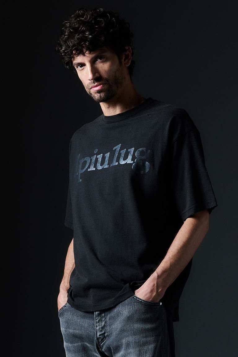 やや身巾にゆとりを持たせたベーシックな ヴィンテージ風のクルーネック半袖Tシャツです。 表地は綿100%のコーマ天竺です。 コーマ糸とは、通常の糸(カード糸)を工程に加え、 短繊維の除去と繊維の平行度を良くするための コーマという機械を通して精製した綿の細番手高級糸をいい、 毛羽がなく、さらりとなめらかな肌触りが特徴です。 ケミカルウォッシュとグラインダー加工(衿、袖口、裾のみ)と、 ロゴプリントにて着古したヴィンテージの雰囲気を表現しています。 また「1piu1ug」プリントはロゴデータ自体にかすれを加え、 更にクラックインク(ひび割れ)にパール粉を混ぜてメタリック感を表現しています。 生産国:日本