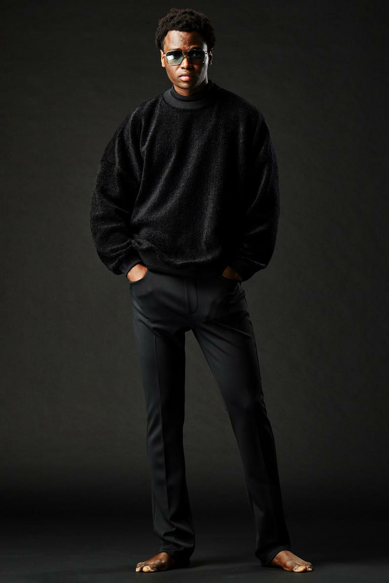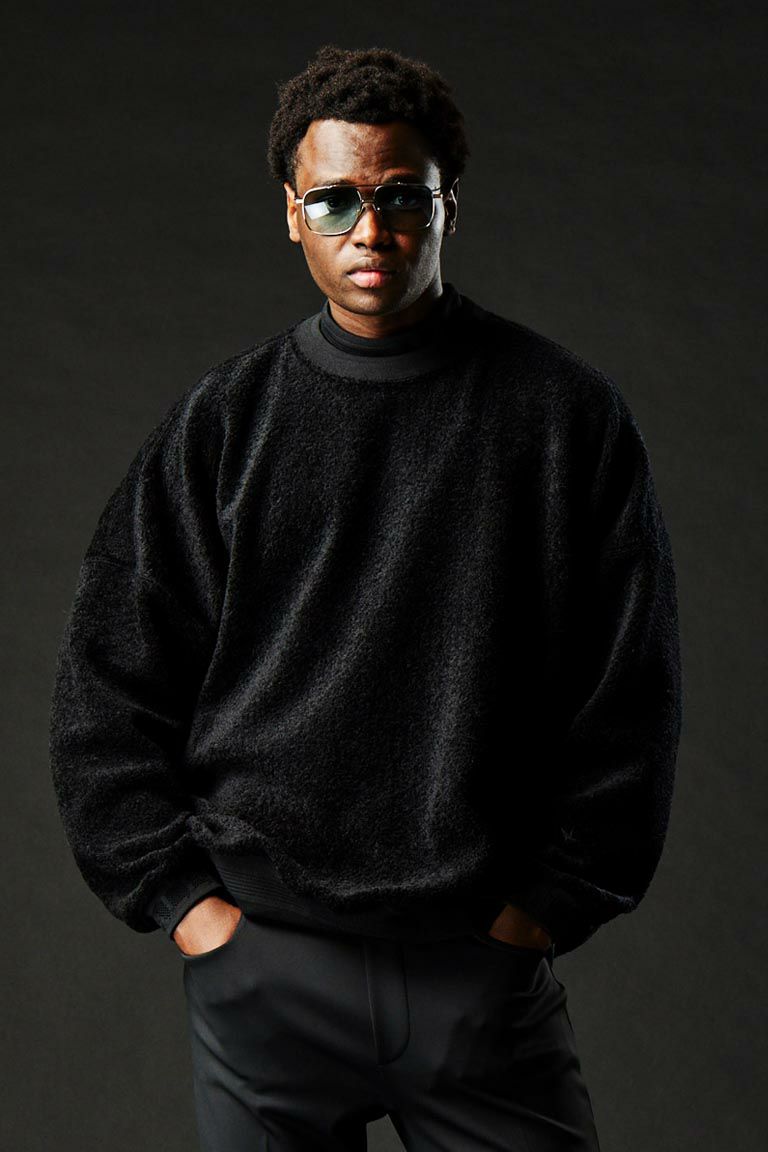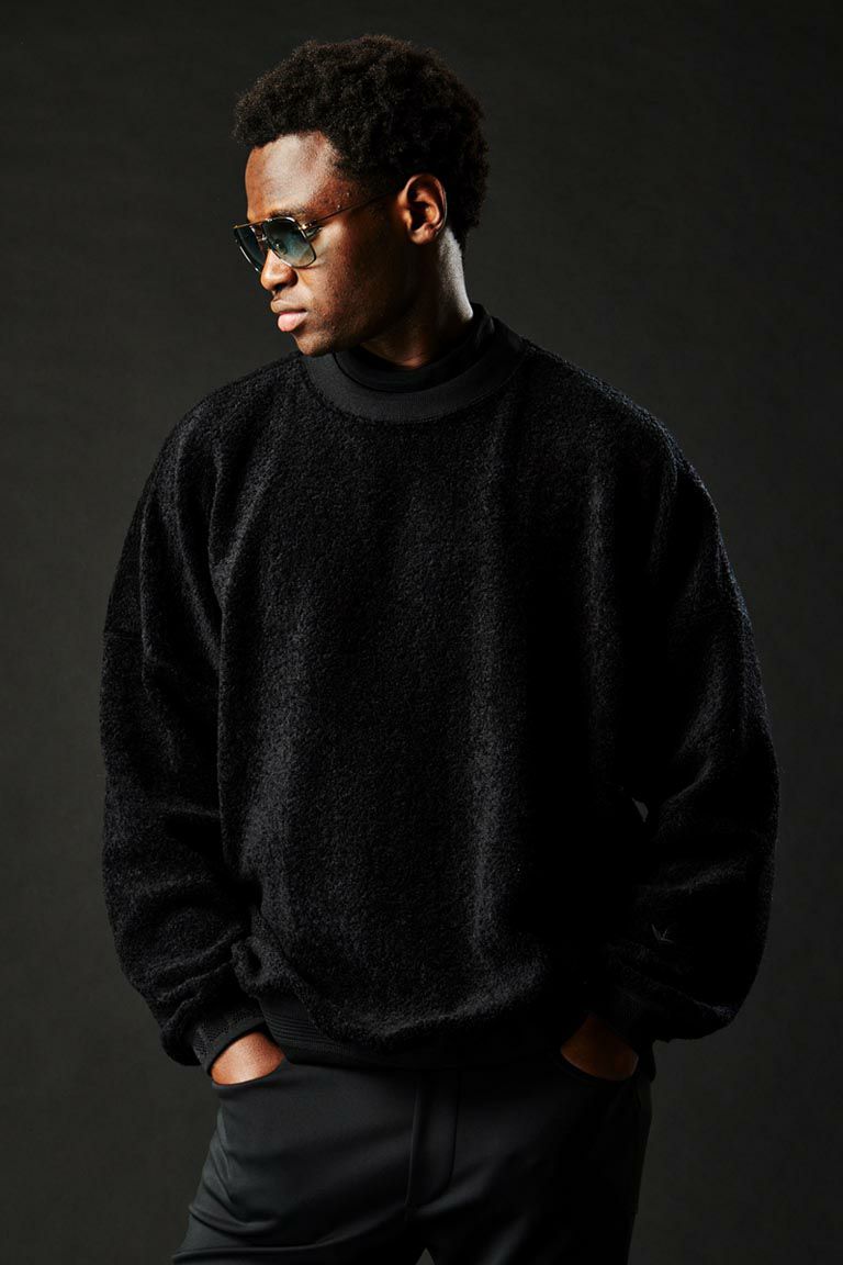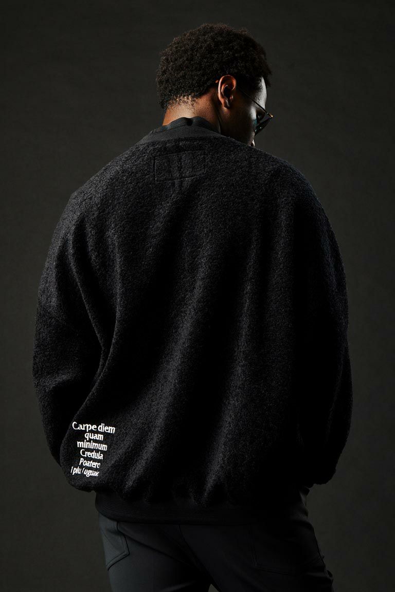 天幅を狭く引き締まるネックポイント、美しくドロップする ワイドパターン仕様に変更され、より大人のビッグシルエットに仕上げました。 ショルダーからアームにかけて美しくドロップする形状。 計算されたオーバーサイズスペック。 身頃素材には合繊糸でカール状に編み立てたBOA KNIT素材。 ナチュラルな伸縮性と軽量で滑らかな表情。 あらゆるシーンで活躍します。 BLACK/BK GREY MIXの2色展開。 後身頃には紀元前1世紀、古代ローマの詩人ホラティウスが詠んだ 「Carpe diem(カルペ・ディエム)」—— 「一日の花を摘め」「今を楽しめ」という言葉を3D刺繍により刻印。