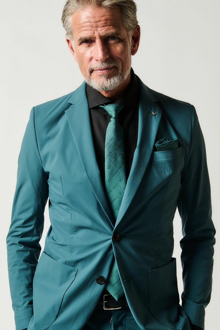 ブランドアイコンである折鶴と1piu1uguale3ロゴを極細シルク糸と、 高密度なジャカード織りで繊細に表現しつつ、シルク素材の滑らかな光沢感にも拘り、 シャドーなソリッドカラーで表現したモノグラムパターンです。