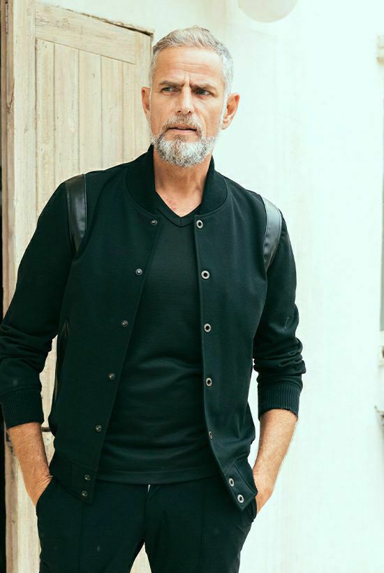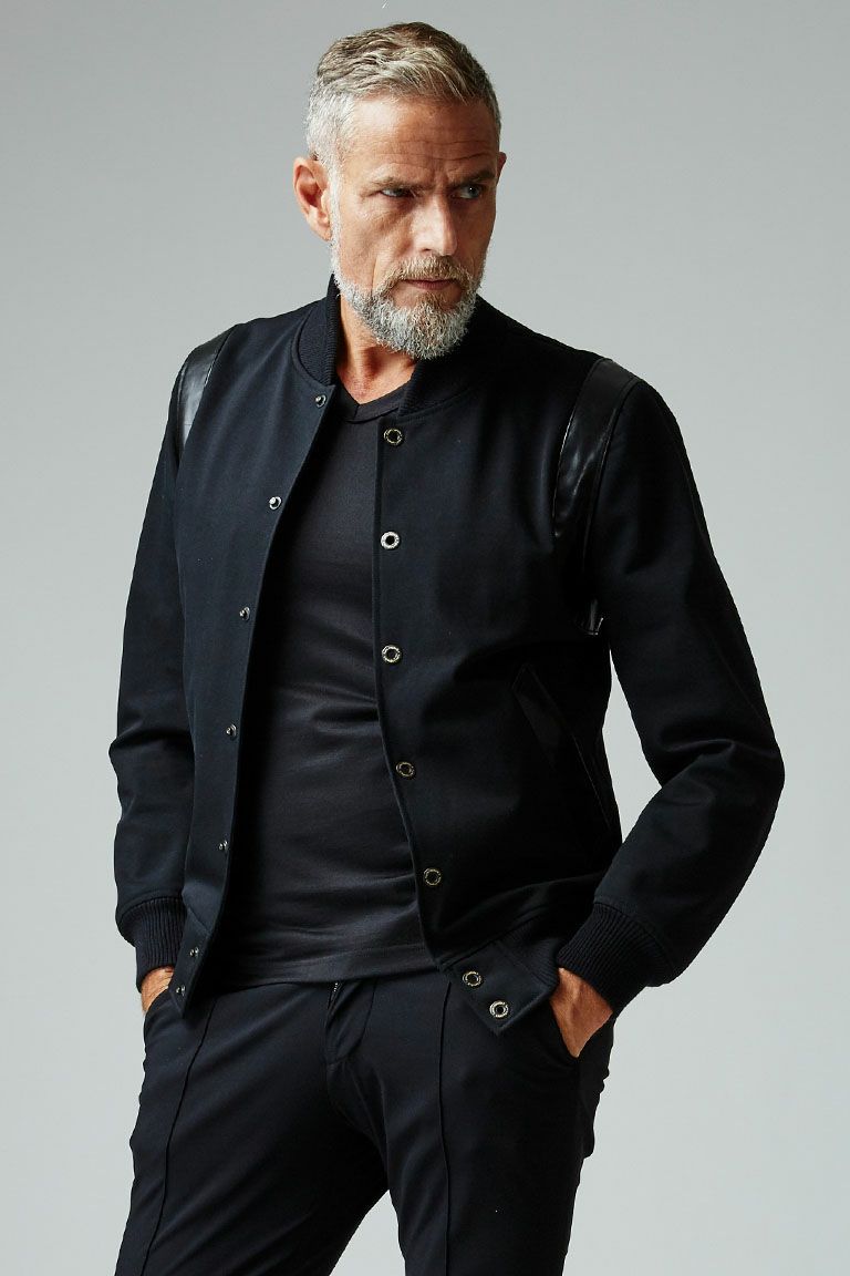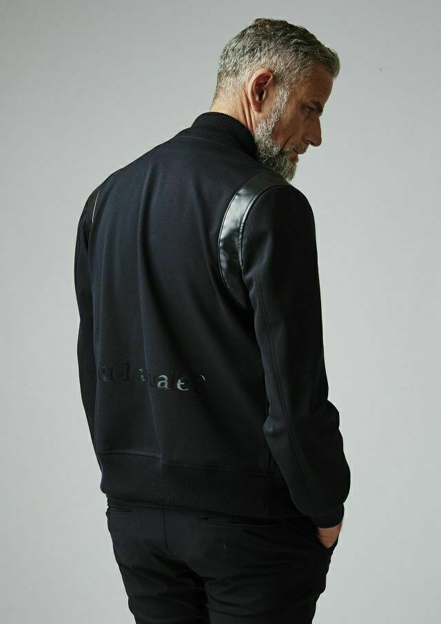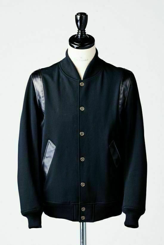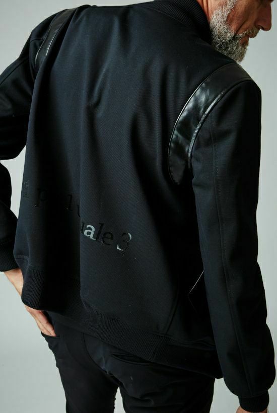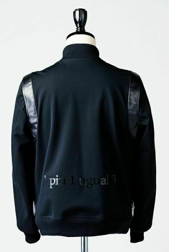 1950年代のアメリカのアワードジャケットをモディファイ。 表地は布帛(織物)見えする、綾目が立ったジャージ(編物)を採用。 肩と腰ポケットには本革(牛革)を別布使いし、リブはT/C(ポリエステル/コットン)を採用しています。 後身腰に「1piu1uguale3」小文字ロゴを独特な光沢感がある箔プリントしています。 また、特徴的なのはドーナツ型のドット釦です。 このドット釦は名だたるメゾンブランドも採用する、 イタリア・COBRA(コブラ)社に別注した1piu1uguale3オリジナルです。