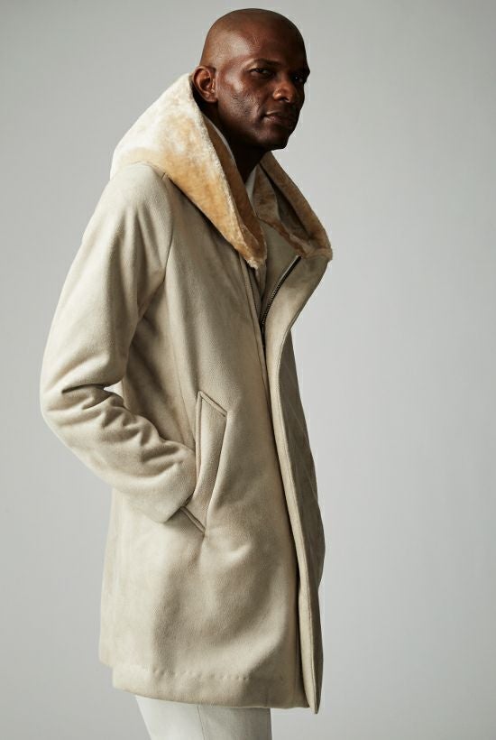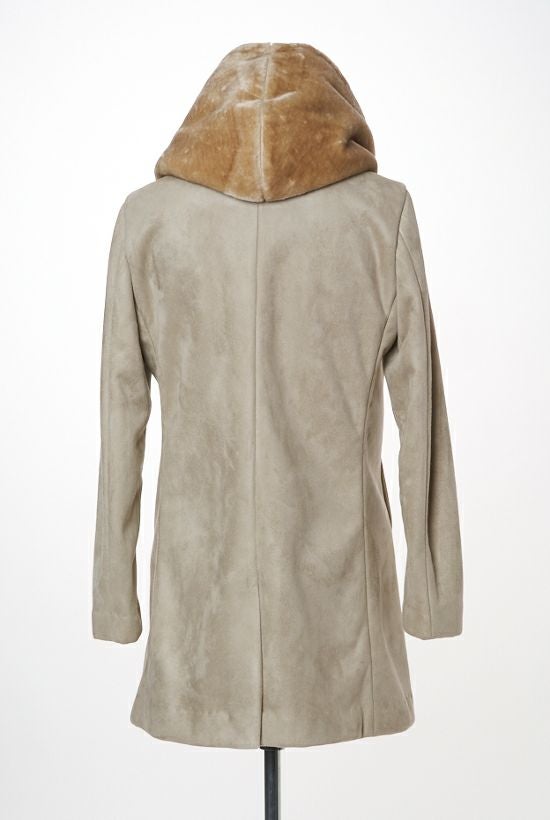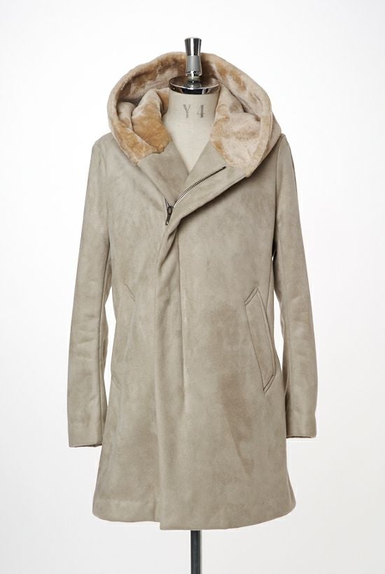 1PIU1UGUALE3を代表するアイコン 「WRAP NECK HOOD COAT」。 大きめなフードが特徴的なフーデットコートは フードが前に落ちるように分量配分し 襟腰を付けることで、ネックに添い立つよう計算し 構築的パターンメイキングを採用。 クラシックな仕立てに見られるセンターベント始末と 箱ポケット仕様がカジュアルな 印象を払拭し上品な印象を与え、 ハーフ丈に設定することで エレガントな装いを演出します。 ZIPPERはSUPER RACCAGNI。 【エコムートン】 フランスのエコペル社企画のエコファー素材。 数多くのメゾンブランドを顧客に持ち、 そのクオリティレベルの高さは折り紙つきです。