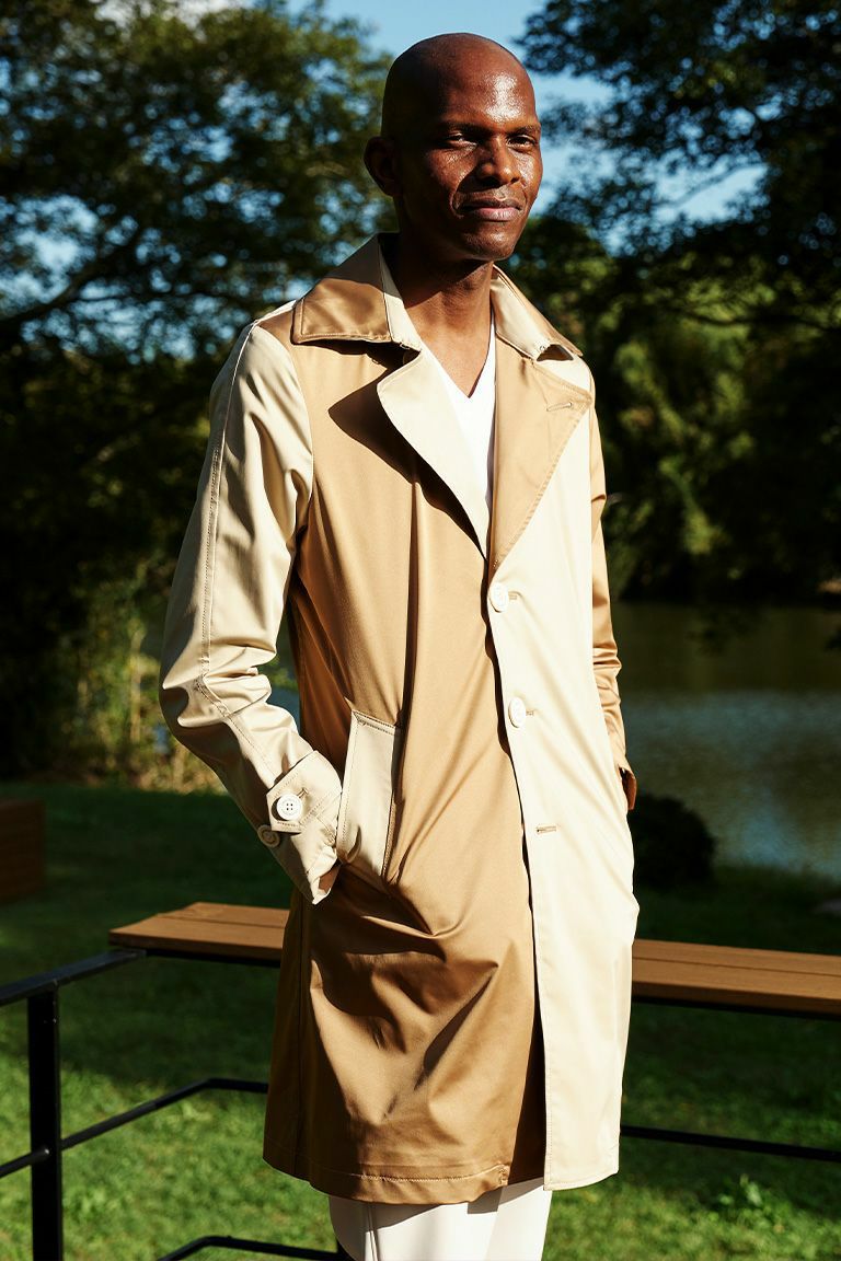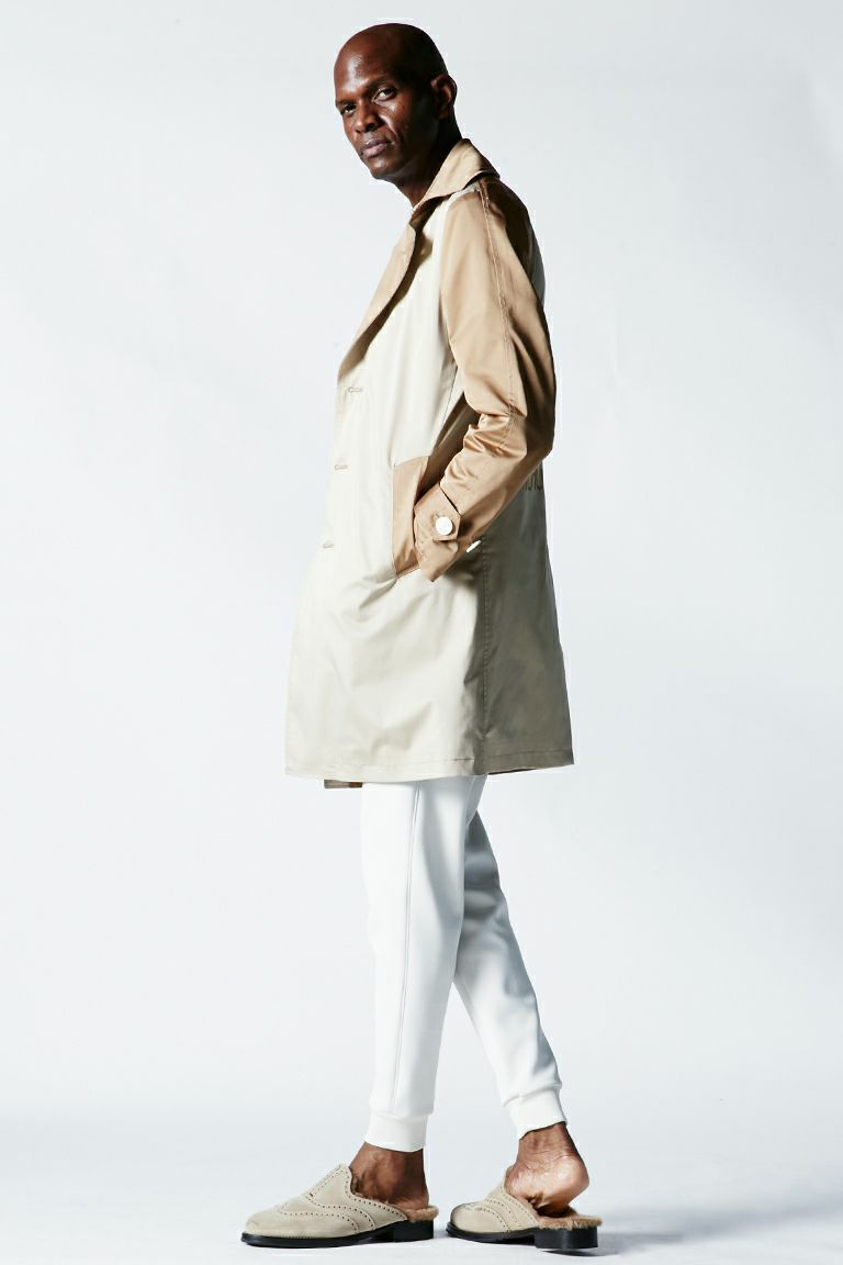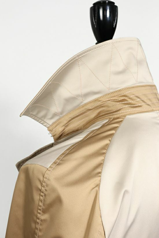 トレンチコートの起源は第一次世界大戦のイギリス軍で 寒冷な欧州での戦いに対応する防水型の軍用コートが 求められたことから開発されたものです。 もっともその原型は既に1900年頃には考案されており、 第一次大戦での普及から一般への広がりを見せてからも 軍服としての名残を多く残す完成されたデザインで、 実用性が高くかつ外観的にも機能美に優れることから 1930年代以降、英国紳士服の定番の一つとなりました。 そんな歴史あるトレンチコートのクラシックな作りに 1PIU1UGUALE3オリジナルパターンをミックスした今作。 人体の立体構造上高度な技術を必要とする 変則的なフロント・セットインスリーブ、 バック・ラグランスリーブを採用することで、フロントスタイルをシャープに、 バックスタイルはソフトな印象に仕上げています。 また、襟の形状・ラペルバランスから釦のバランスまで 緻密に計算し完成させました。 ベージュとオリーブはクレイジー配色仕立て、黒は単色で表現しております。 後腰位置に「1PIU1UGUALE3」ロゴをプリントし、 シンプルな中にスパイスを効かせています。