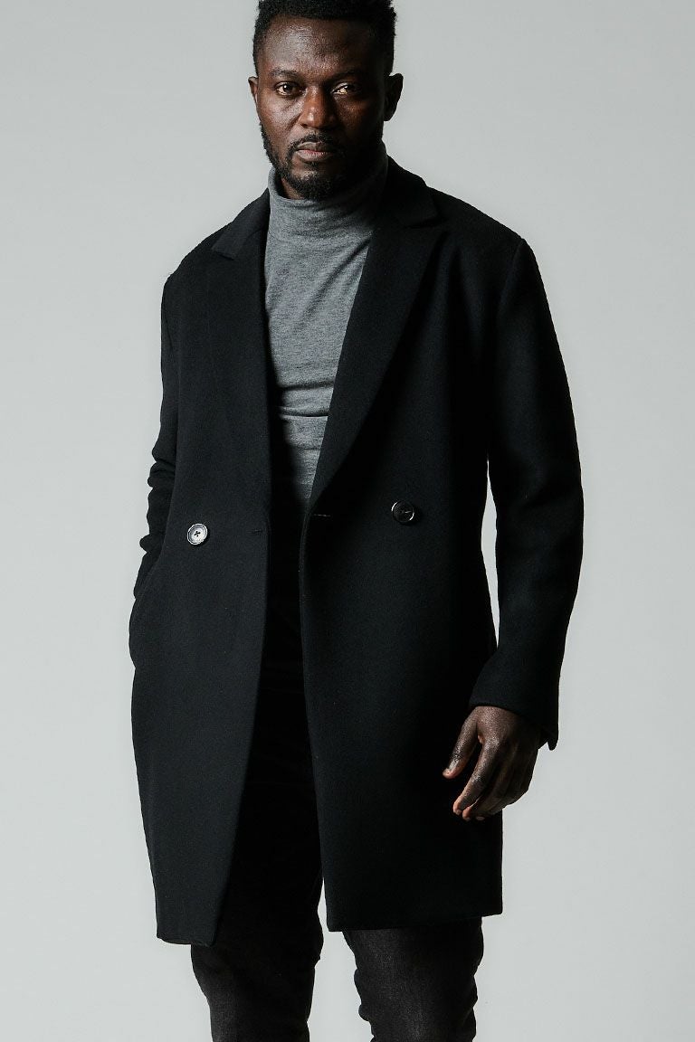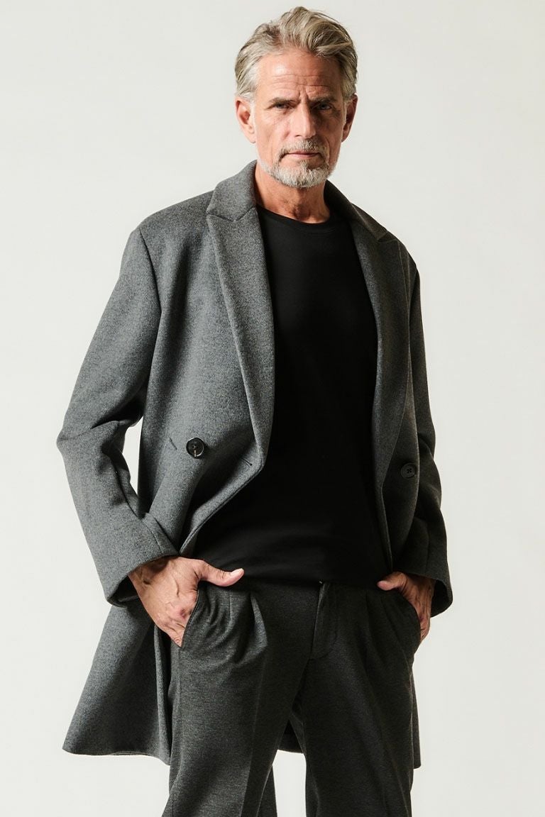 迫力のあるピークド襟と、ウエストループが上品さを醸すダブルチェスターコート。