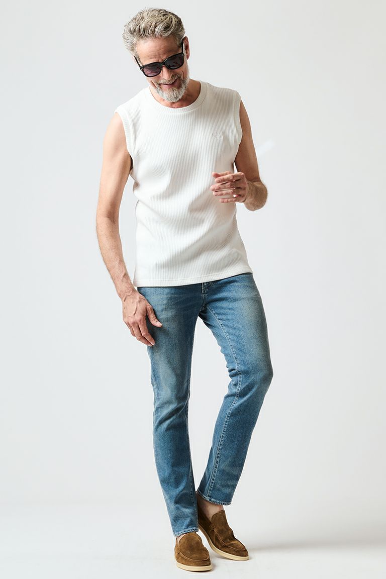 シャープなデニムに仕上がっています。本モデルのステッチ色はC/#白はベージュ系、C/#インディゴと