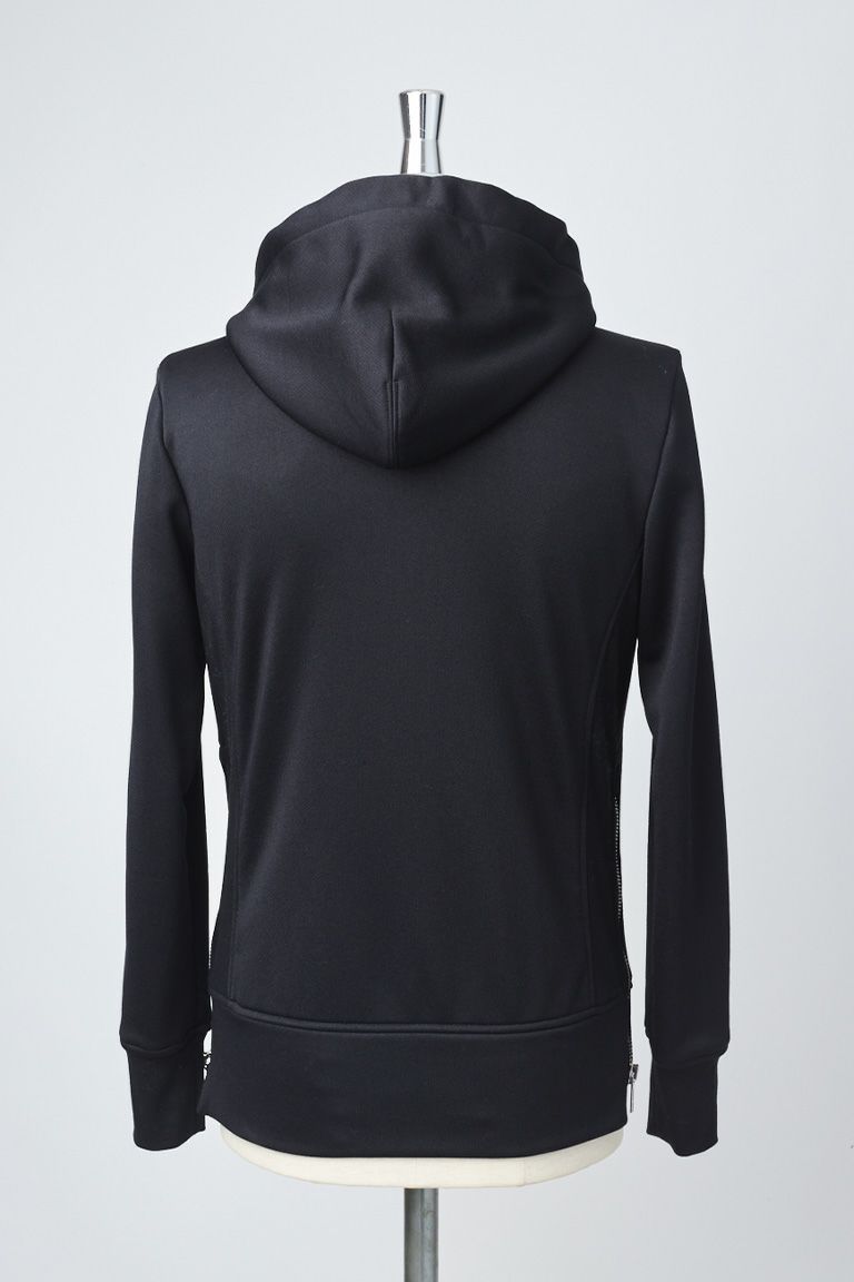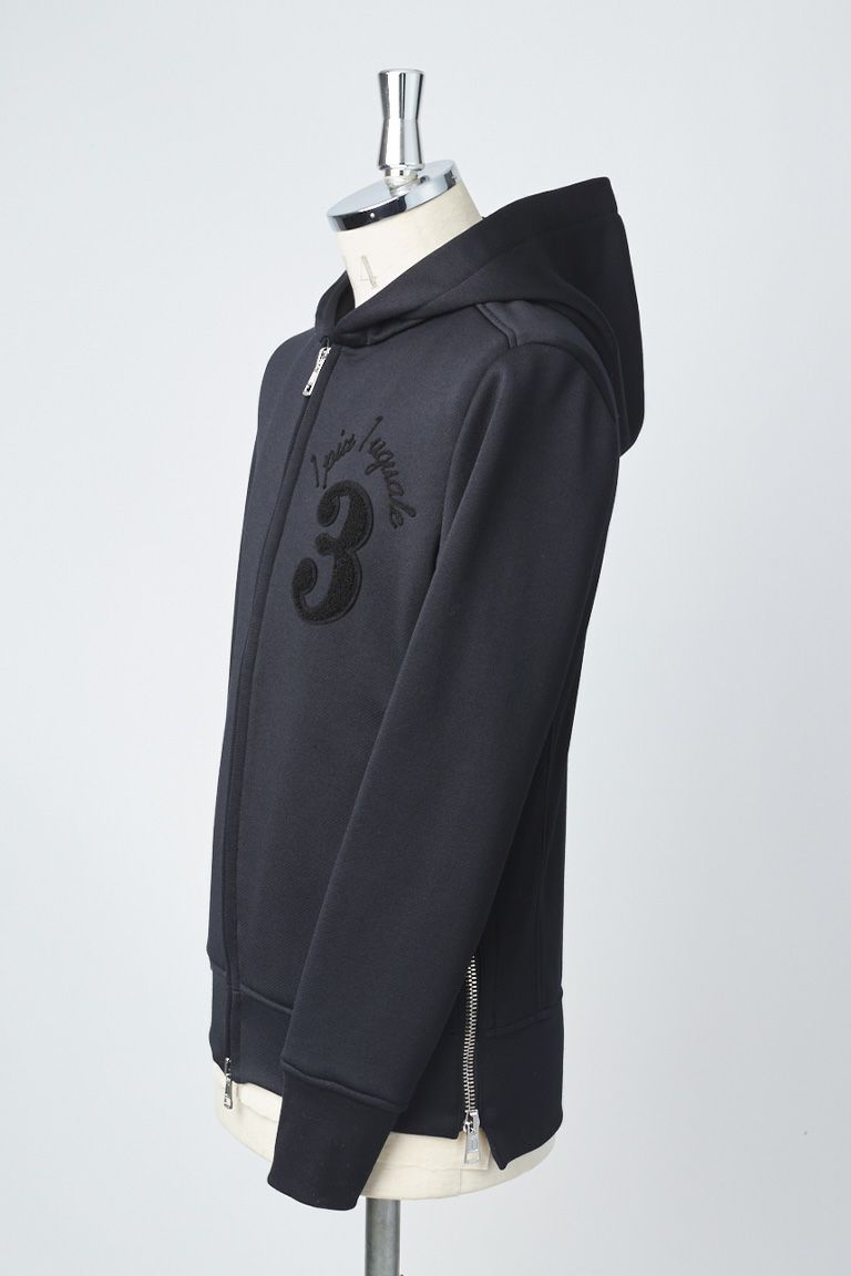 SIDE ZIP PARKA NO.3ワッペンのスウェットパーカー ベースの型を新たにパータンメイキングし、 裾のサイドZIPが特徴です。 製品加工後にサガラ刺繍による アイコニックなブランドロゴを施しています。 フードは首に乗るように形成し適度なサイズで構築し、 前身と後身の着丈に差を付けることで 独自の間のあるタイトフィットとファスナーを 開いた際にこなれた印象を醸します。