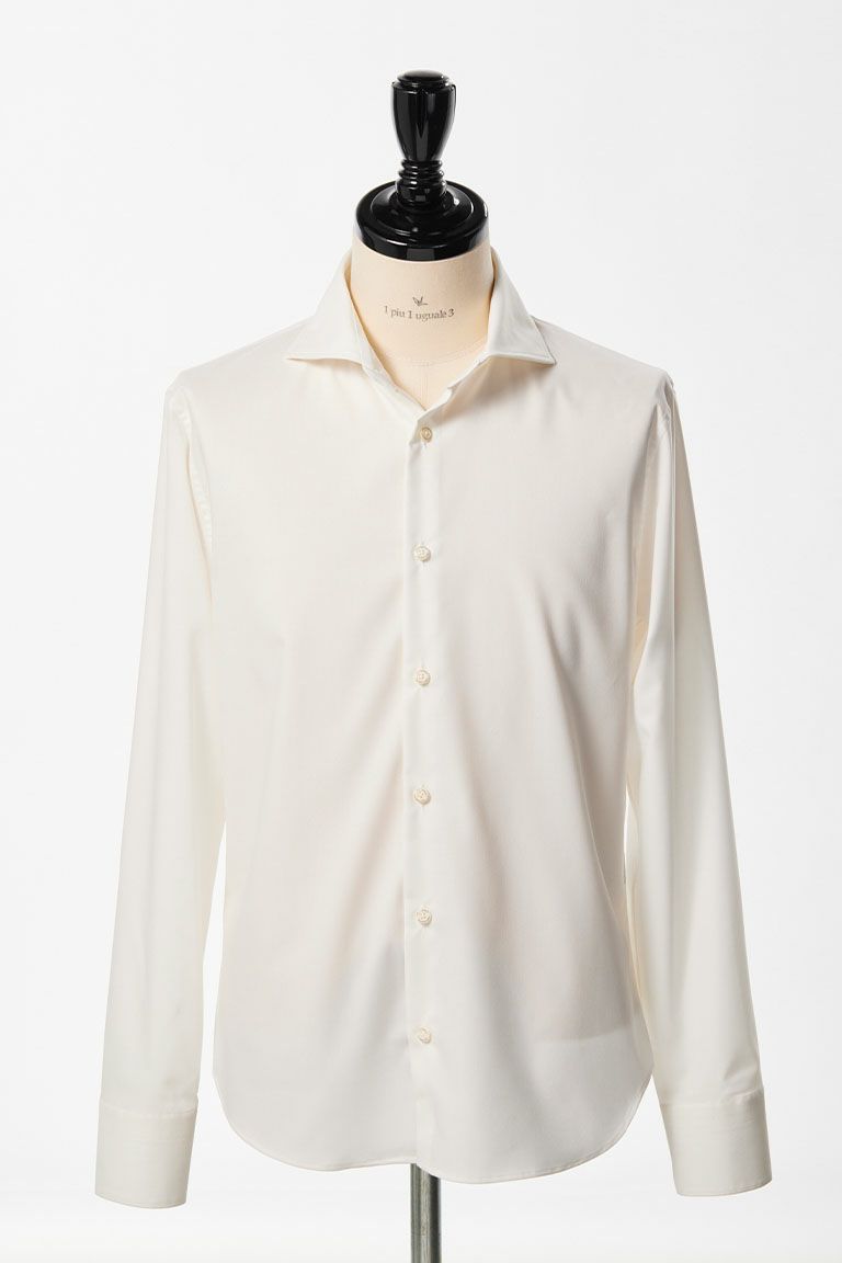 1piu1uguale3の定番として展開している 襟先の広がったホリゾンタルカラーを採用したプレーンシャツ。 首元の見え方を重視し、襟開きが180度に近く、 ややオープンカラー気味に綺麗に開く様に形成しています。 附属する釦はドレスシャツによくある貝釦ではなく、 1piu1uguale3 ロゴ入りの本水牛シャツ釦を採用しています。